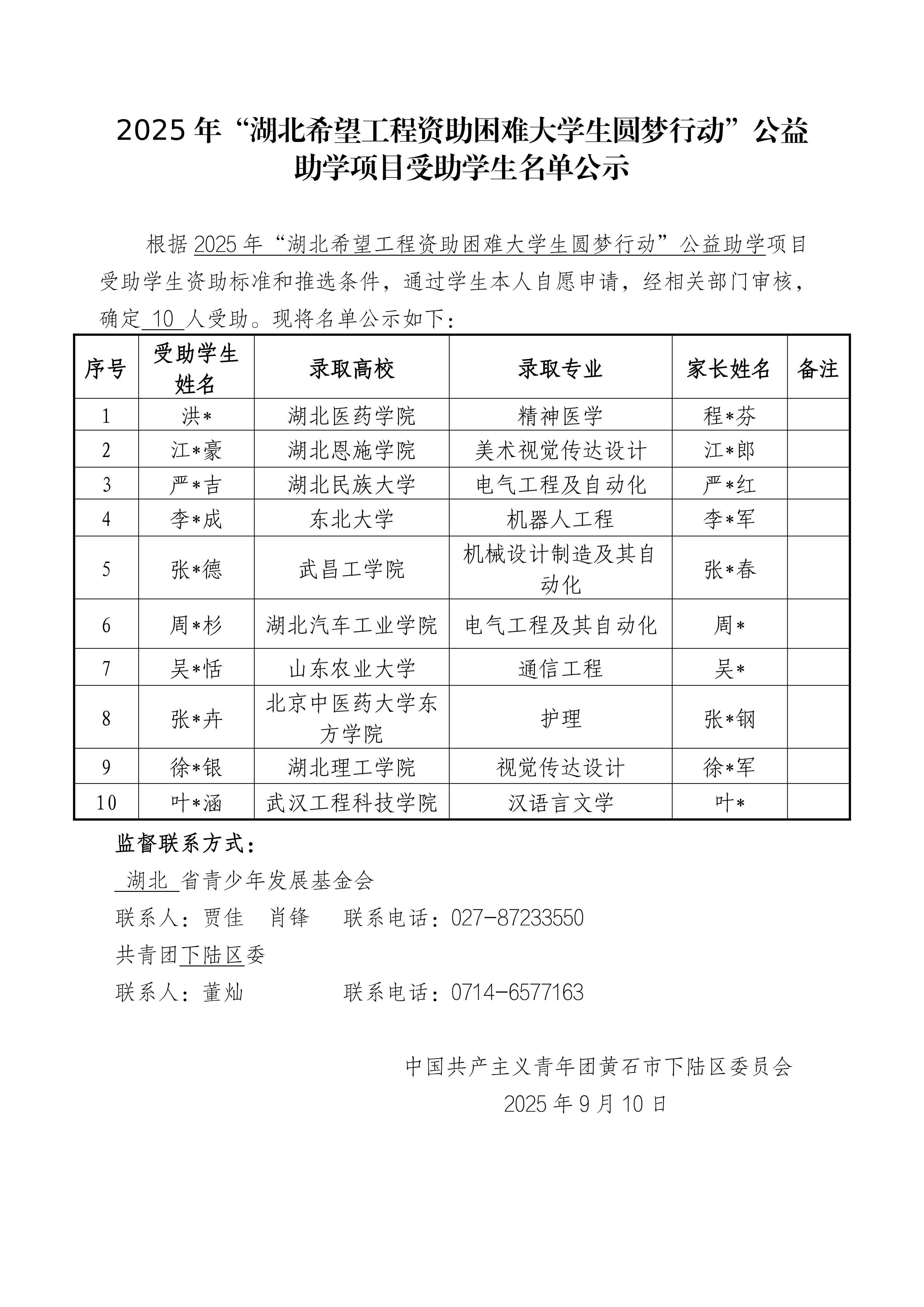 2025年“湖北希望工程资助困难大学生圆梦行动”公益助学项目受助学生名单公示