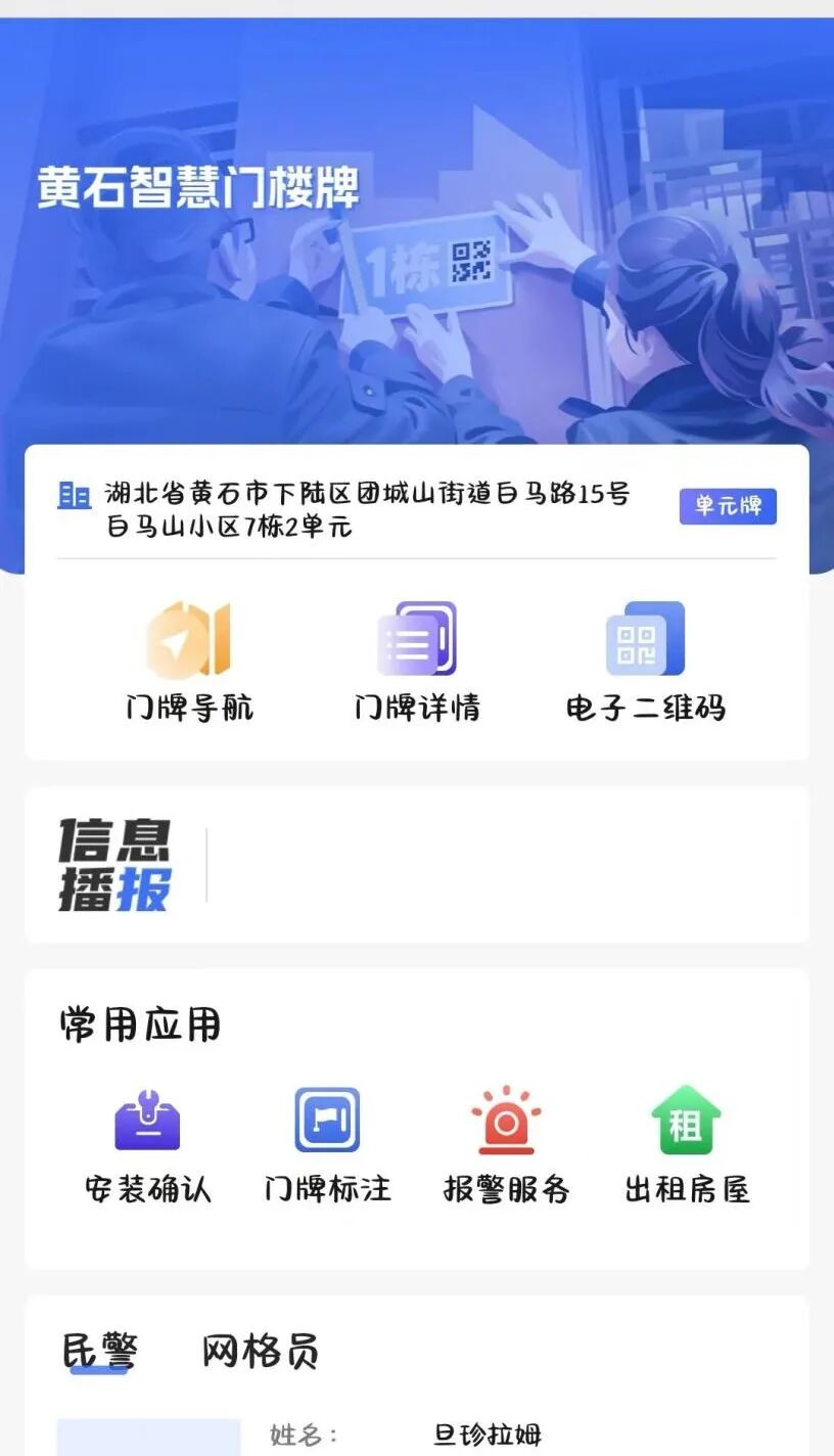 黄石市“数公基”项目自团城山试点以来,系统平台不断完善,“二维码门楼牌”则是“一标三实”(标准地址,实有单位、实有人口、实有房屋)工作的重要组成部分。据了解,居民通过扫描“二维码门楼牌”可以就近联系社区民警或网格员,还具有一键报警、生成房屋电子二维码、查看此处的标准地名等功能,其中包括该处所的县(区)、街道、社区、街路巷名称及门牌楼名称等基本信息等等。