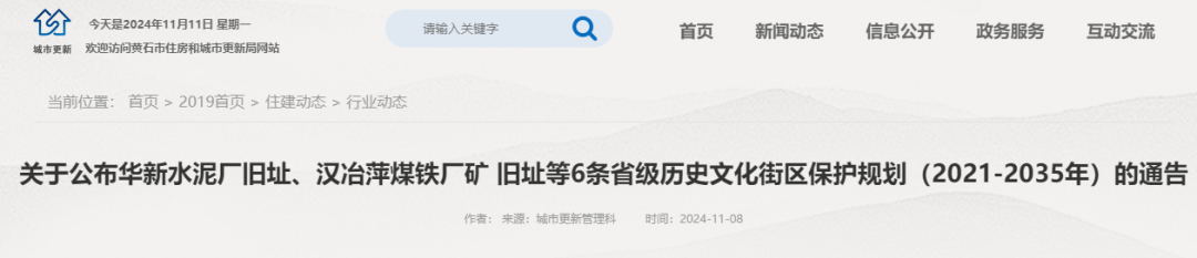 关于公布华新水泥厂旧址、汉冶萍煤铁厂矿 旧址等6条省级历史文化街区保护规划(2021-2035年)的通告