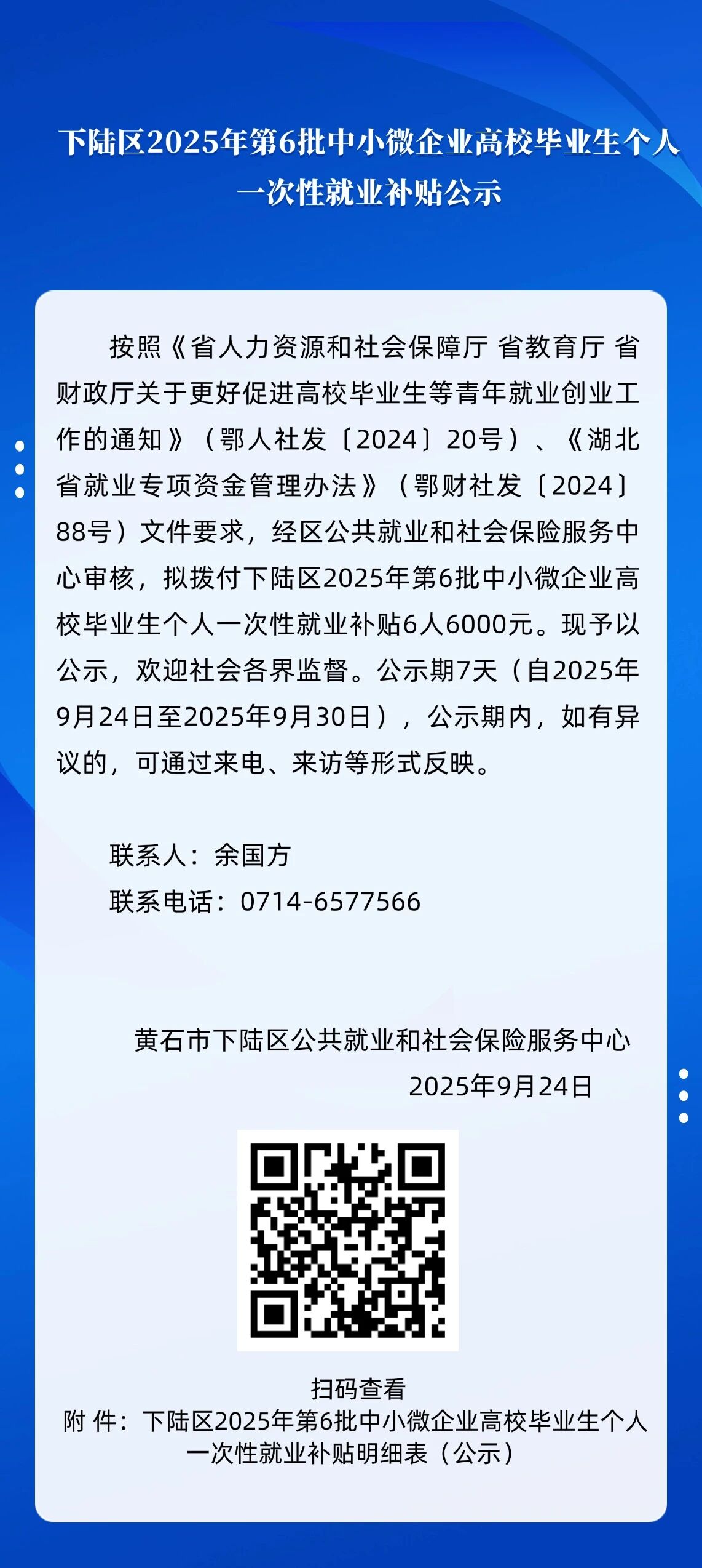 名 称: 下陆区2025年第6批中小微企业高校毕业生个人一次性就业补贴公示