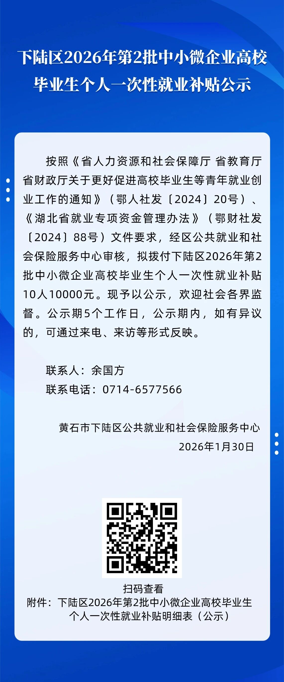 名 称: 下陆区2026年第2批中小微企业高校毕业生个人一次性就业补贴公示