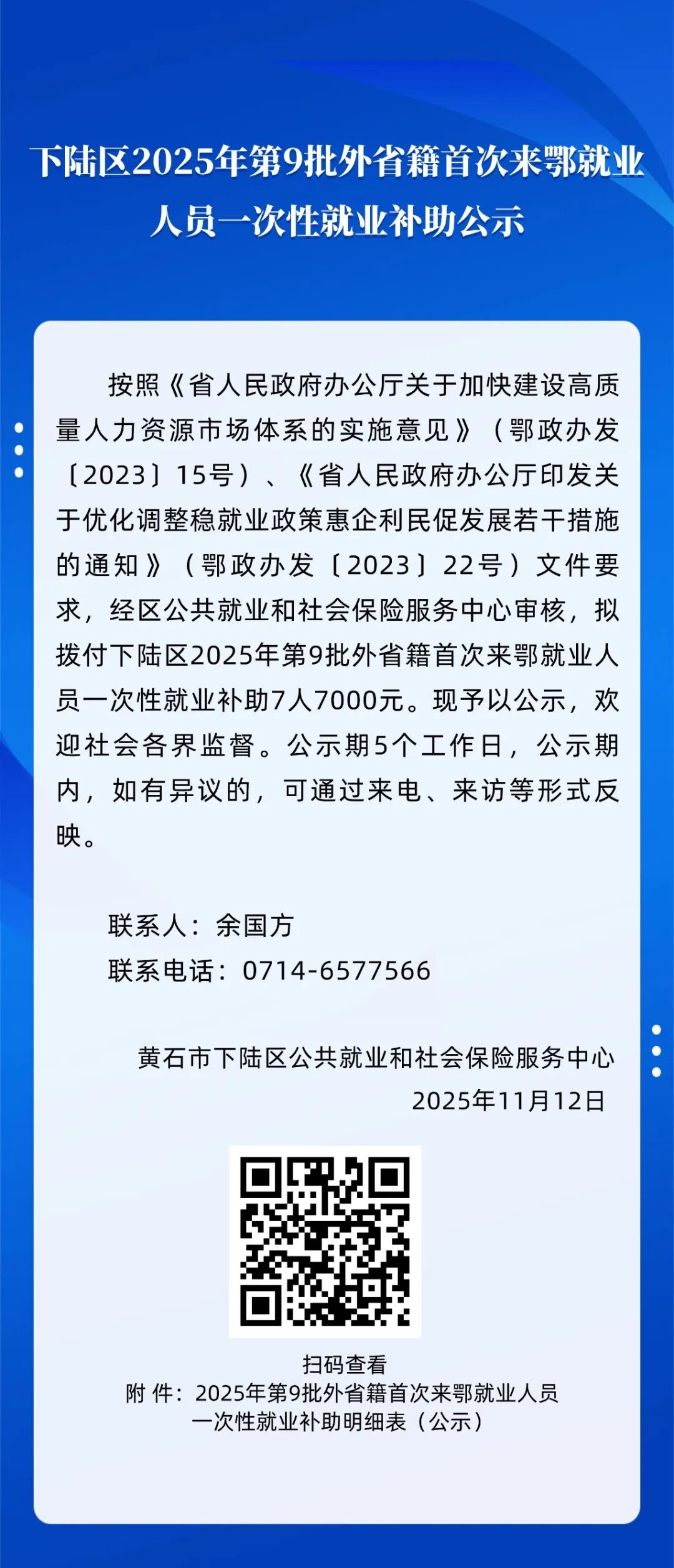 下陆区2025年第9批外省籍首次来鄂就业人员一次性就业补助公示