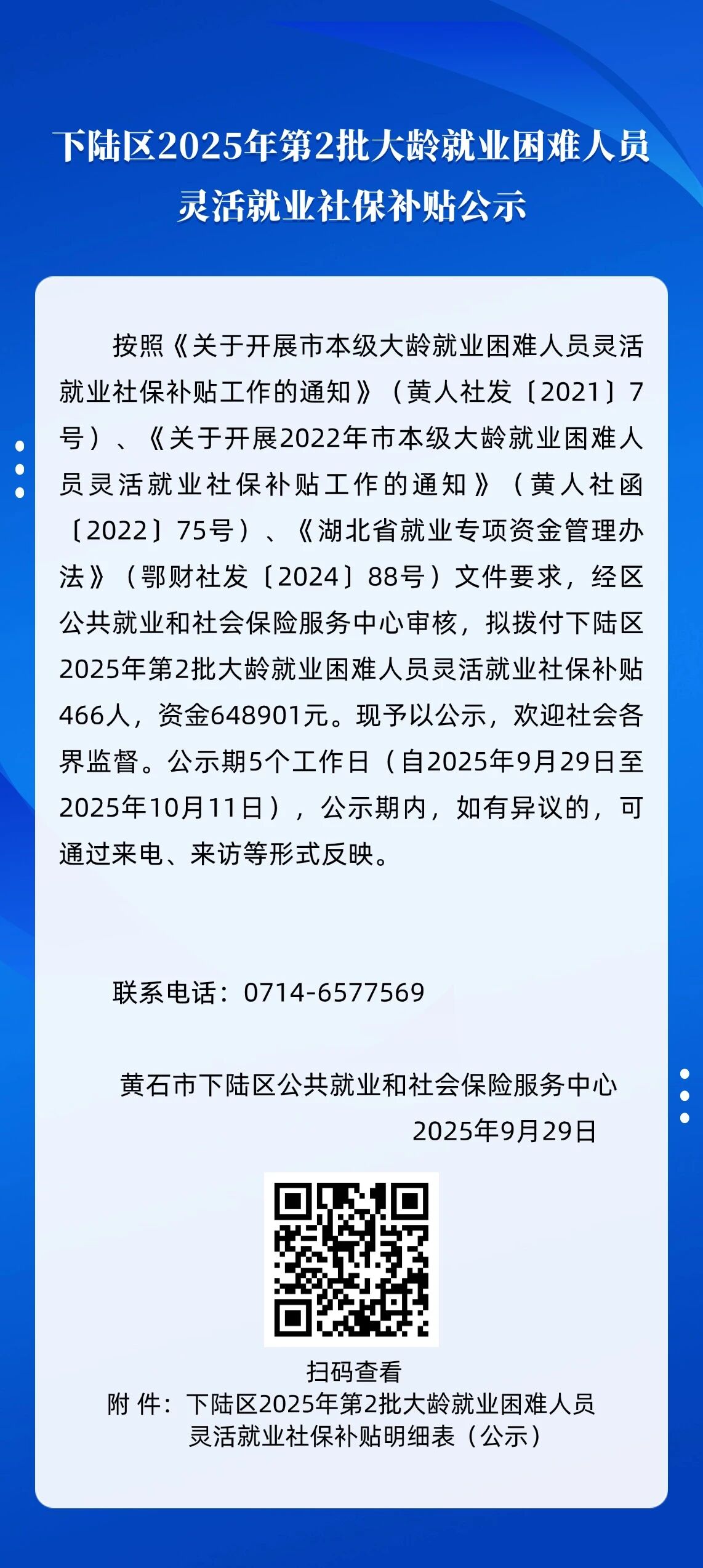 名 称: 下陆区2025年第2批大龄就业困难人员灵活就业社保补贴公示