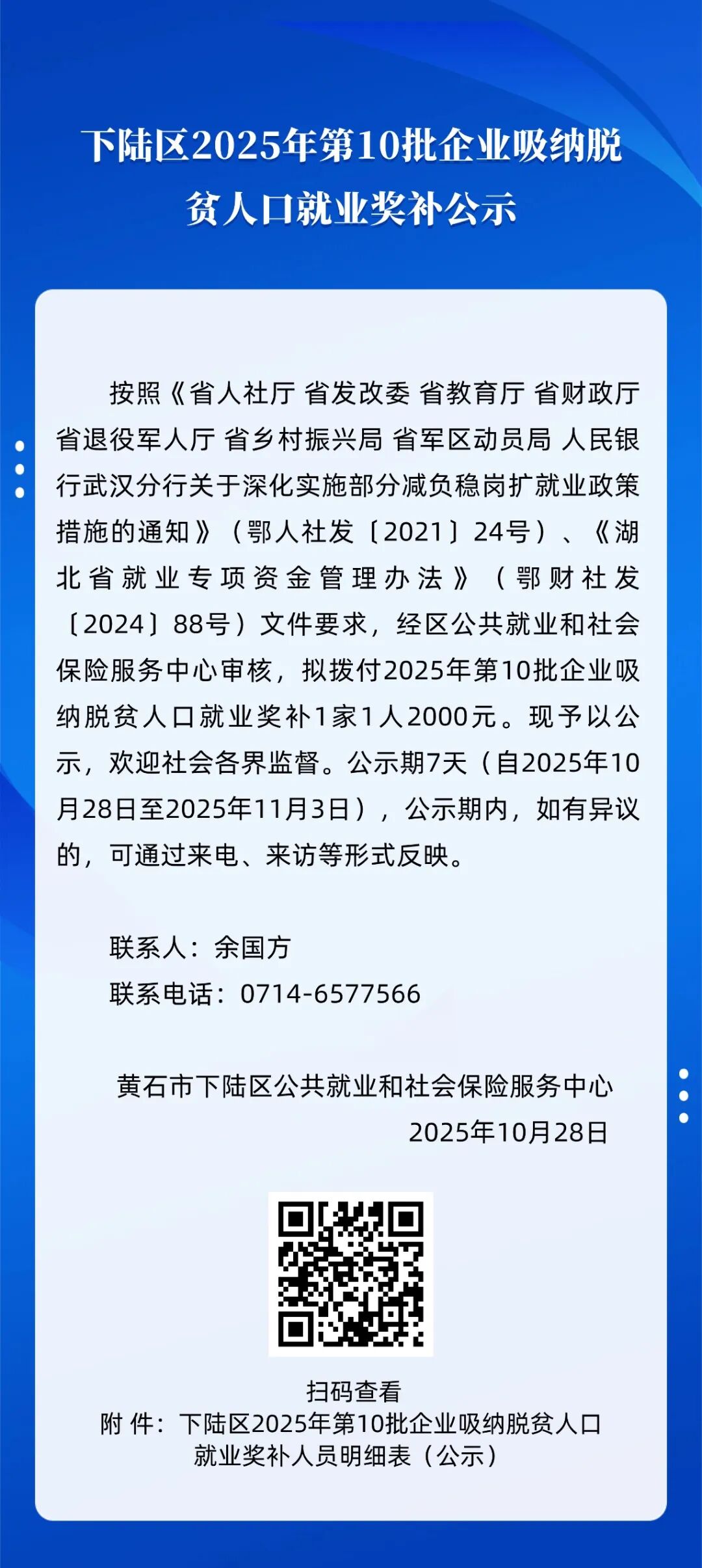 索 引 号: 000014349/2025-79354 发布日期: 2025-10-28 发布机构: 下陆区人力资源和社会保障局