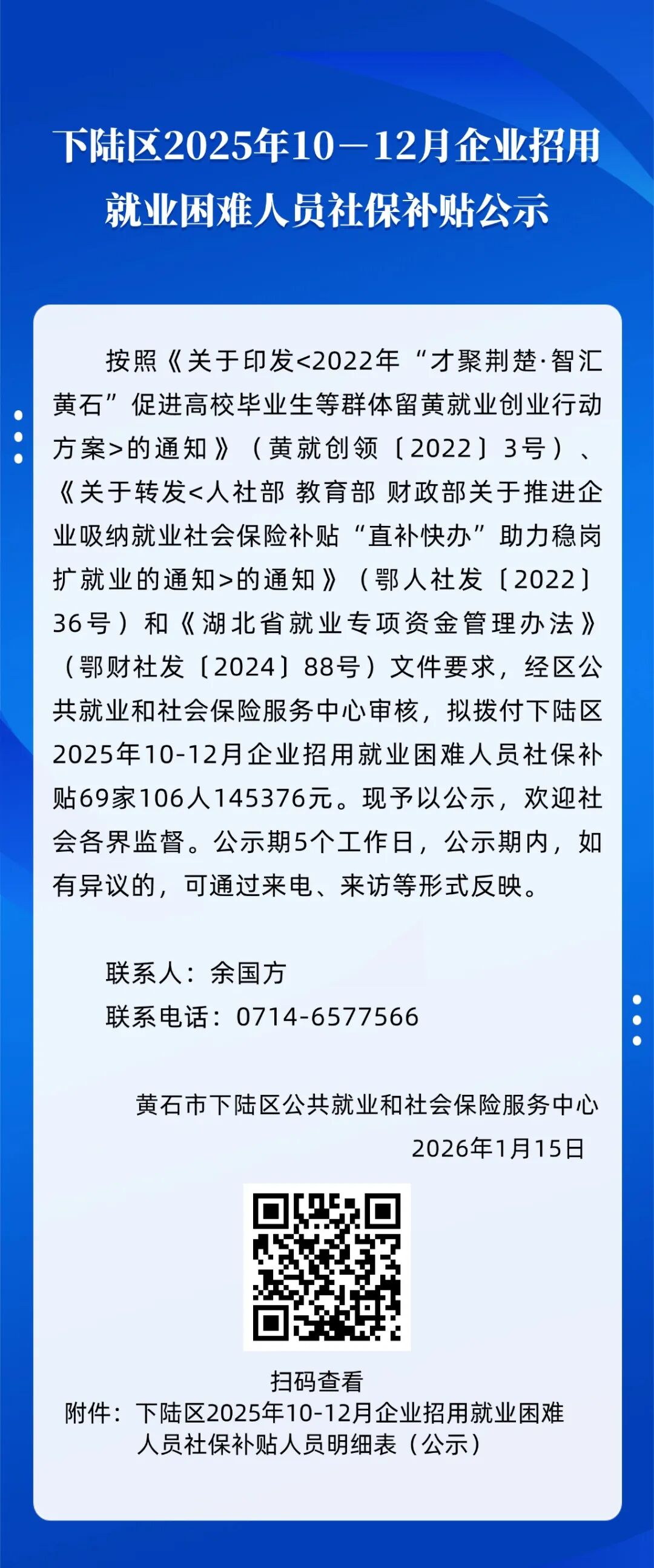 索 引 号: 000014349/2026-03309 发布日期: 2026-01-15 发布机构: 下陆区人社局