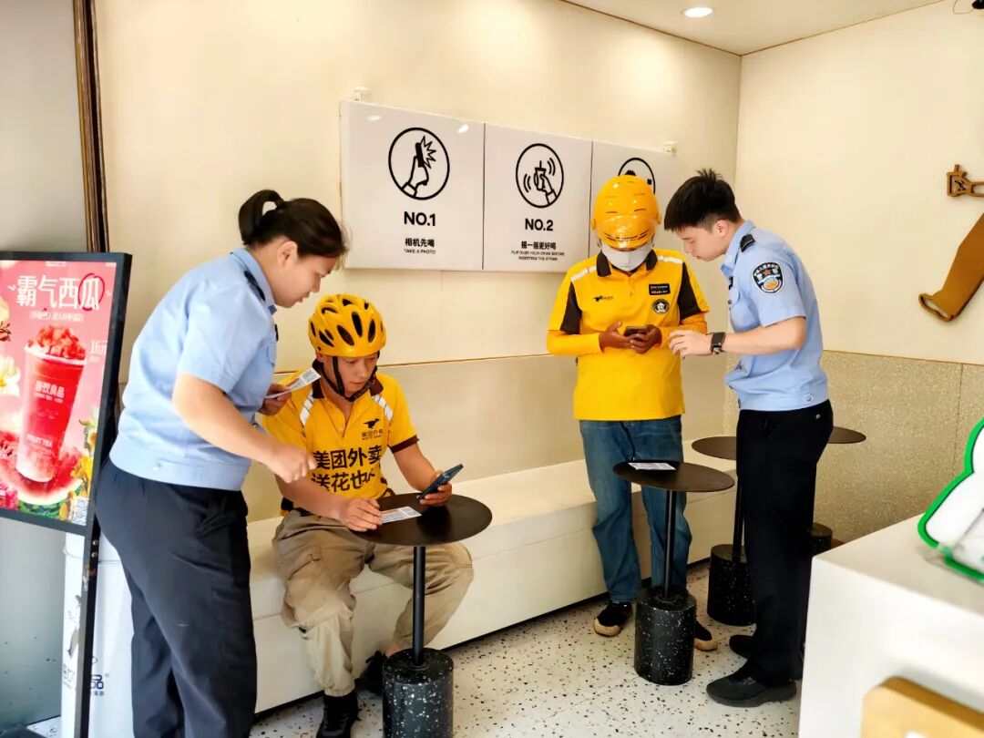 在奶茶店,当民警指导快递小哥扫码学习时,新颖的普法形式立即吸引众多顾客驻足。短短半小时,店内的普法贴纸就被群众自发拍照转发,形成“扫一扫、学一学、转一转”的传播效应。外卖骑手小王边扫码边说:“送餐路上就能学法,这种‘碎片化学习’正适合我们。”