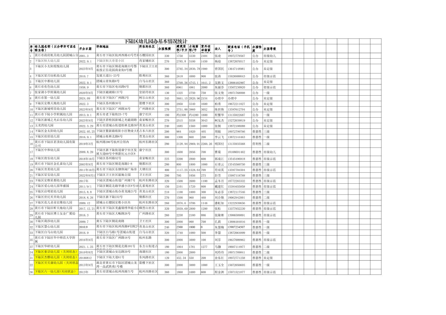 下陆区幼儿园基本情况统计表2025年
