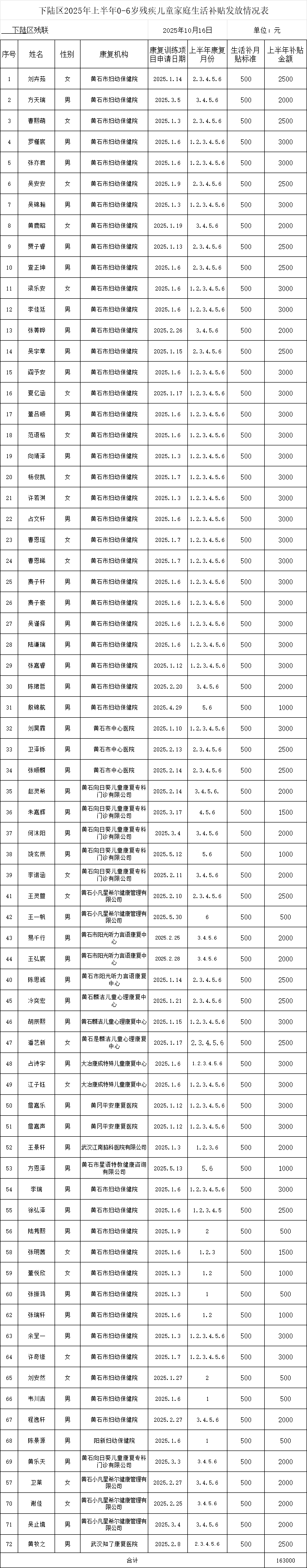 名 称: 下陆区2025年上半年0-6岁残疾儿童家庭生活补贴发放情况表