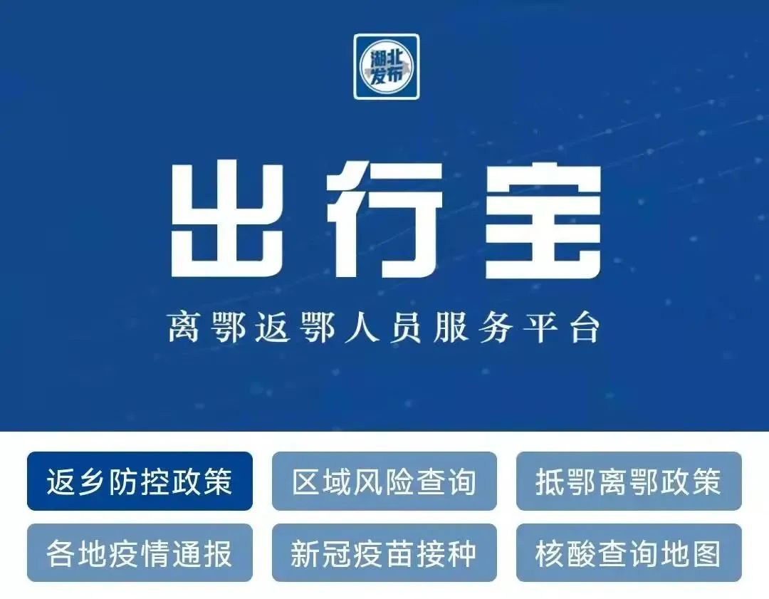 ↓↓↓ 查询方法一 点击下方卡片 关注“湖北发布”微信公众号 第二步 在后台输入任一关键词 “返乡、返鄂、防控、政策” 第三步 点击弹出链接 “出行宝 离鄂返鄂人员服务平台” 第四步 进入服务平台后 根据需求可查询 “返乡防控政策” “区域风险查询” “抵鄂离鄂政策” “各地疫情通报” “新冠疫苗接种” “核酸查询地图” 查询方法二 在对话框底栏点击 “出行宝”进入页面