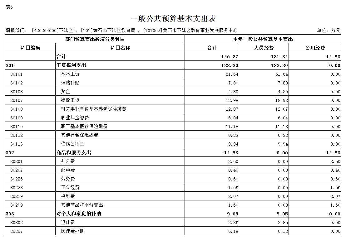 按照综合预算的原则,下陆区教育事业发展服务中心所有收入和支出均纳入部门预算管理。收入包括:一般公共预算拨款收入;支出包括:一般公共教育支出;2024年度收支总预算 146.27万元。