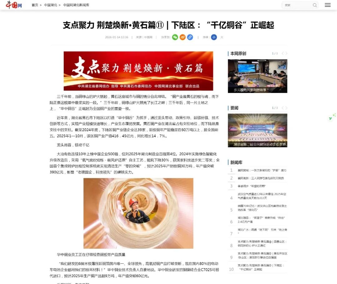 近年来,我区以打造“华中铜谷”为抓手,通过龙头带动、政策引导、延链补链、技术创新等方式,实现产业规模快速增长,产业生态蓬勃发展。黄石铜产业在湖北省占有支柱地位,而下陆就是支柱中的支柱。截至2024年底,全区铜产业链企业达39家,阴极铜年产能稳定在60万吨以上,居全国前五。2025年1—10月,该区铜产业产值416.45亿元,同比增长14.7%。大冶有色连续10年上榜中国企业500强,位列2025年湖北省制造业百强企业第4位。2024年实施绿色智能化升级改造后,采用“氧气底吹熔炼-鼓风炉还原”自主工艺,能耗下降30%,获国家科学技术进步奖二等奖;全国首个集成转炉远程控制系统更实现清洁生产“零的突破”,预计2025年产阴极铜30万吨,年产值突破390亿元,彰显“老牌国企,科技领先”的硬核实力。“我们研发的6微米极薄压延铜箔国内唯一、全球领先,高氧韧铜产品打破垄断,现在国内80%的电动车电池企业都用我们的极耳材料!”华中铜业技术负责人自豪地说。华中铜业研发的铜镍硅合金C7025可替代进口,预计2025年生产铜产品超9万吨,年产值突破60亿元。区委、区政府研究制定《下陆区深入推进产业链供应链链长制的落实方案》,近两年为铜企争取政策资金3250万元,设立专项奖励推动企业“专精特新”发展。“政府搭台,企业唱戏,产业链才能在共赢中茁壮成长。”一位专班成员王女士表示。通过举办中国铜加工产业年度大会等高规格活动,“华中铜谷”品牌日益响亮,2025年湖北省铜产业生态合作大会更推动14个产学研项目集中签约,明确下陆为“三链同构”核心承载区。目前,下陆已形成“冶炼—加工—应用—再生”全生命周期产业生态,依托大冶有色的铜冶炼和华中铜业中游加工的龙头地位,集链成群。铜产业链企业达39家,其中国家级“小巨人”企业4家,省级专精特新企业7家。电子电路铜箔产业集群入选国家级中小企业特色产业集群,铜冶炼及精深加工产业集群连续11年跻身省级重点成长型产业集群。“我们不只是生产铜,更是在编织一条贯穿上下游的价值链。”一家铜加工企业负责人说。同时,我区以铜为媒进一步拓展服务至武汉都市圈新能源汽车零部件和开铁区印刷电路板等相关产业集群,建设湖北新型绿色智能表面处理产业园、高端装备制造产业园,逐步推动铜产业从单一材料向“新能源+电子信息+高端装备”多元应用跃升。我区持续助力辖区企业、高校打造高能级研发科创平台,截至2025年,我区拥有省级以上研发平台30家,形成“实验室+企业+高校”协同创新网络。大冶有色、华中铜业等企业三年累计投入科研经费超7.5亿元,取得专利37项。依托各类创新研发平台,我区正聚焦新兴产业和未来产业,围绕“铜基新材料+工业AI场景应用+绿色低碳转型”为“十五五”期间铜产业发展谋篇布局,力争在超薄高精度压延铜箔、5N高纯金属、陶瓷覆铜(DBC)材料、再生铜高价值利用等领域取得突破。“我们的目标不仅是‘千亿产值’,更是千亿生态。”区有关负责人表示,让每一克铜都释放最大价值,让“华中铜谷”成为真正具有全国影响力的产业地标。随着铜产业链不断深化、创新持续突破,下陆这座三千年铜都作为“华中铜谷”核心承载区,将以“千亿铜谷”为目标,打造以全生命周期的铜产业链为主线,服务辐射上下游企业的产业集群,在新时代的工业宏图中,继续铸造属于自己的金色辉煌。