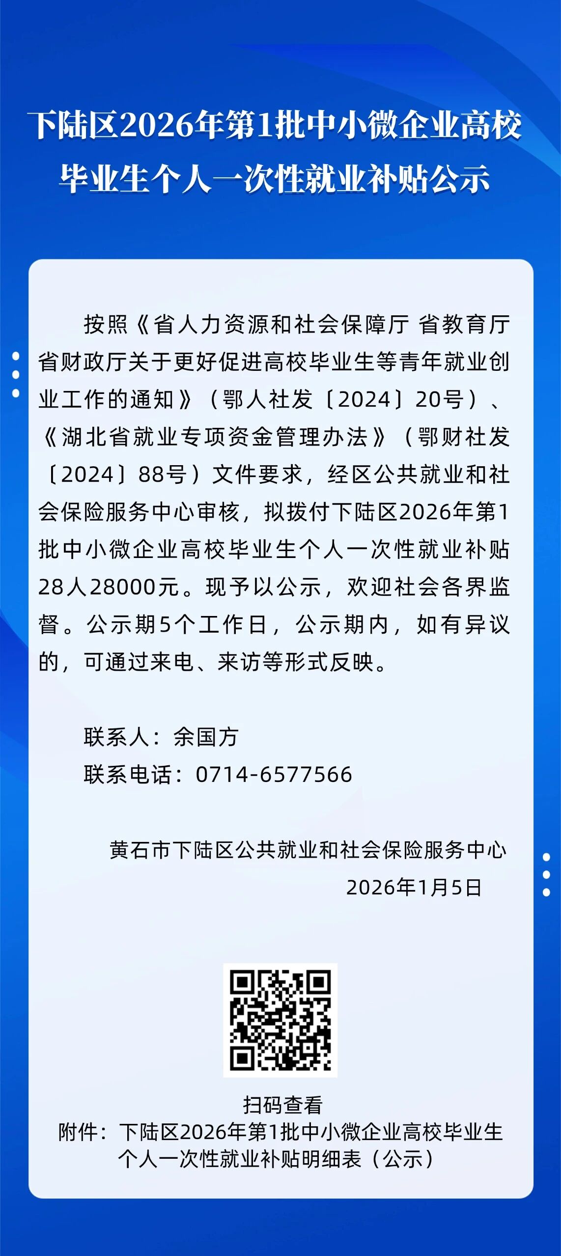 名 称: 下陆区2026年第1批中小微企业高校毕业生个人一次性就业补贴公示