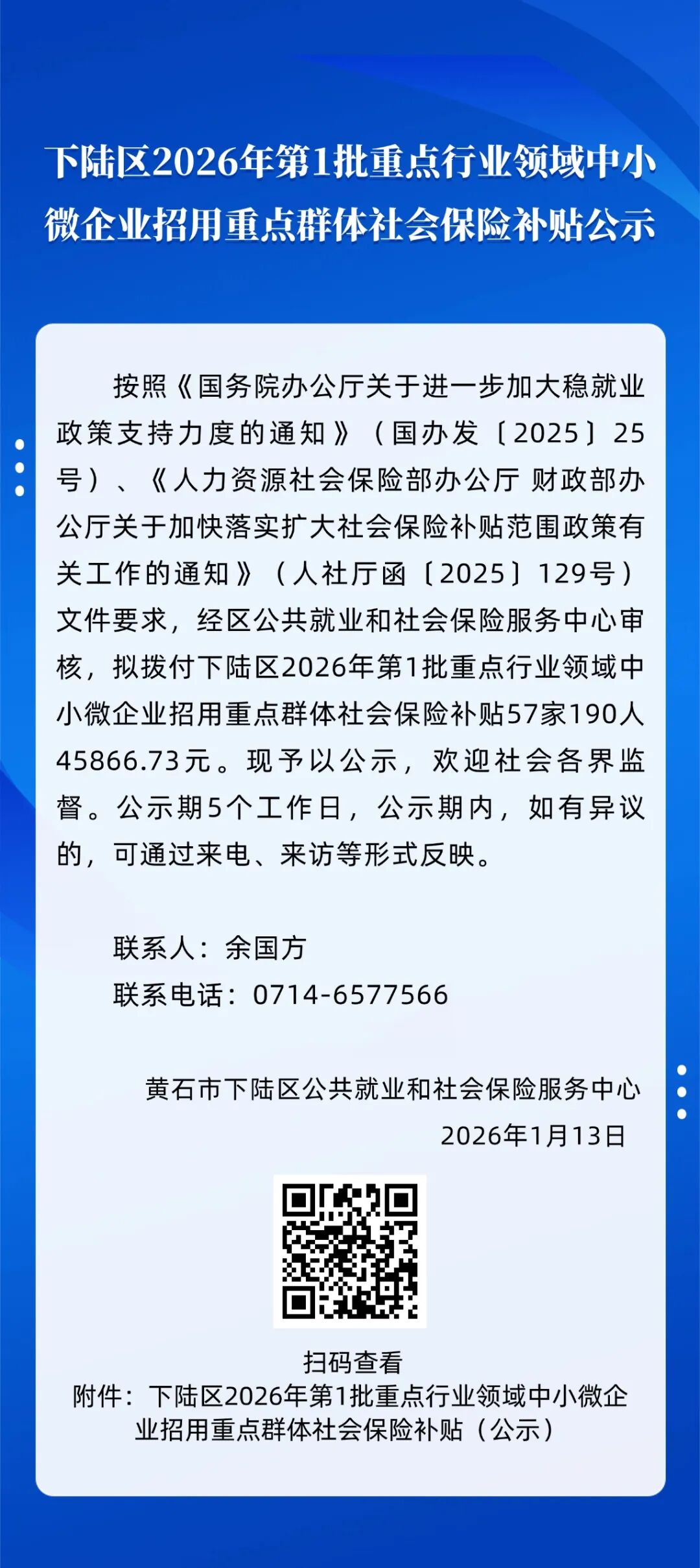 名 称: 下陆区2026年第1批重点行业领域中小微企业招用重点群体社会保险补贴公示