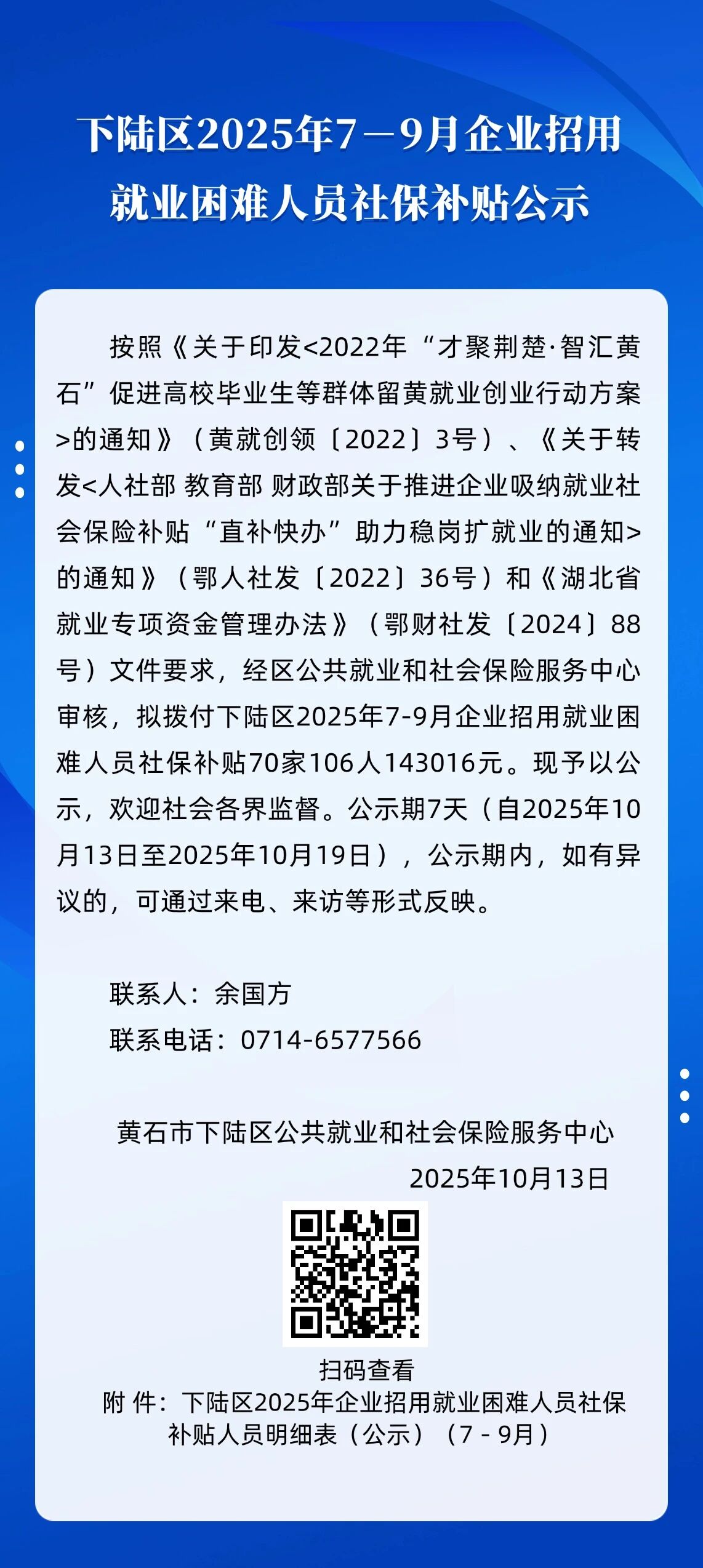 索 引 号: 000014349/2025-75451 发布日期: 2025-10-13 发布机构: 下陆区人力资源和社会保障局