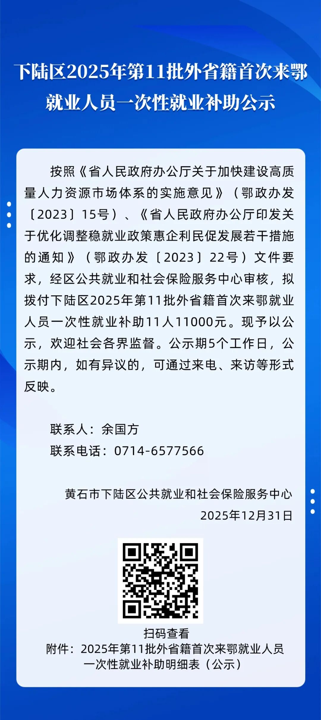 名 称: 下陆区2025年第11批外省籍首次来鄂就业人员一次性就业补助公示