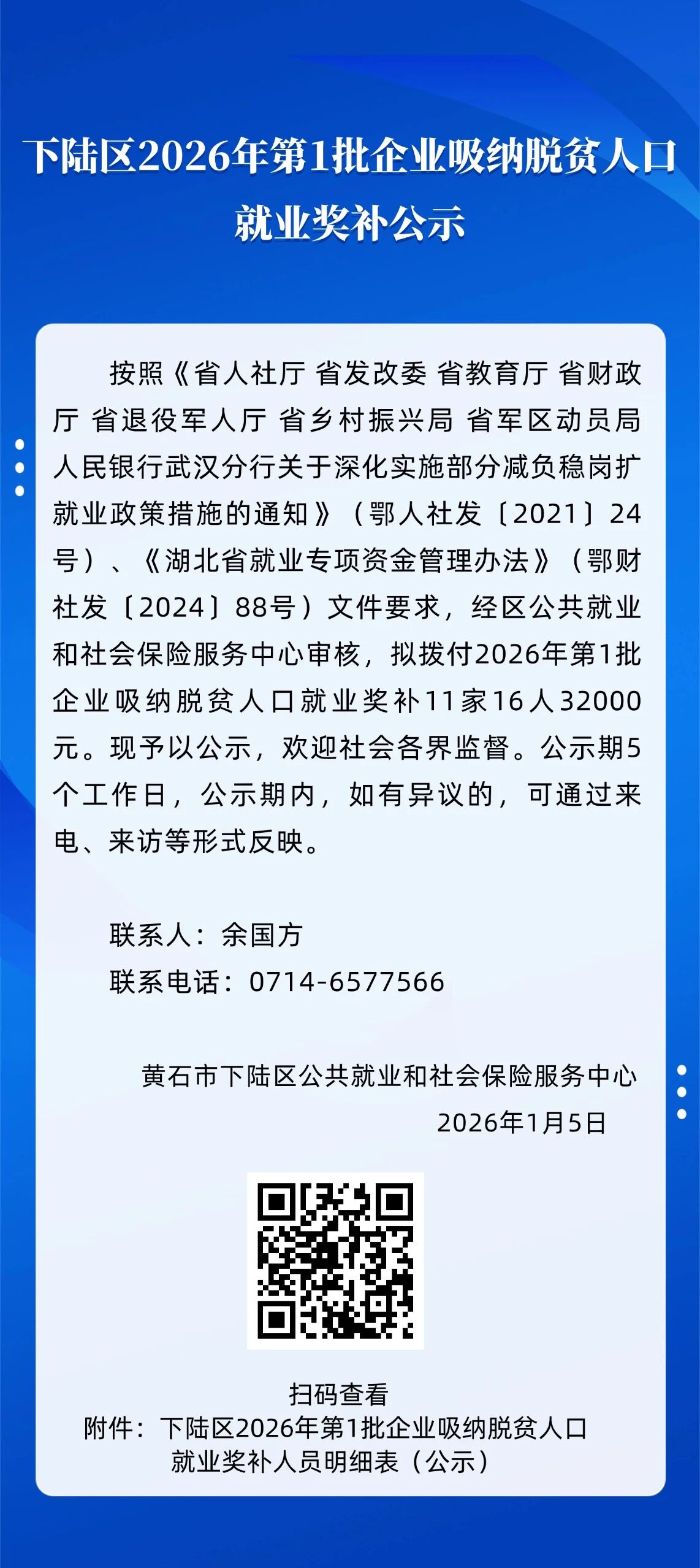 名 称: 下陆区2026年第1批企业吸纳脱贫人口就业奖补公示