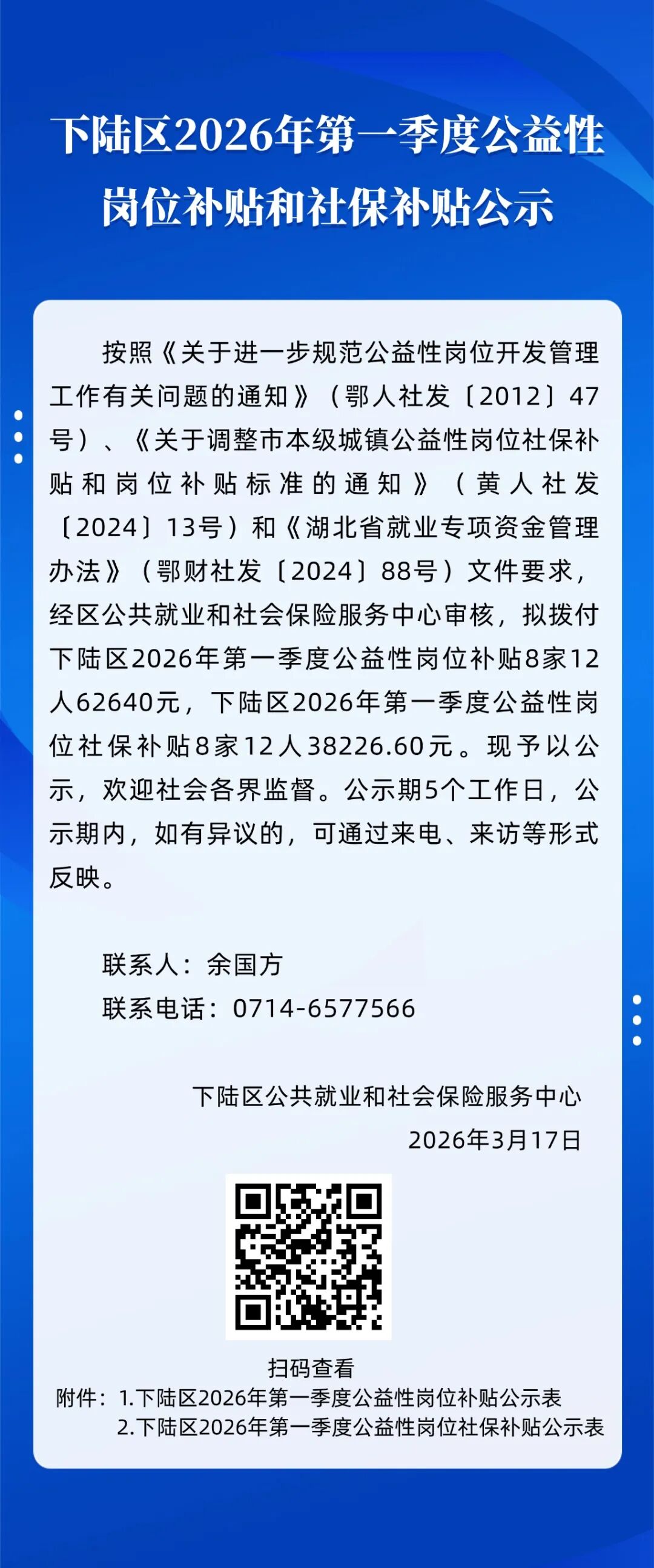名 称: 下陆区2026年第一季度公益性岗位补贴和社保补贴公示