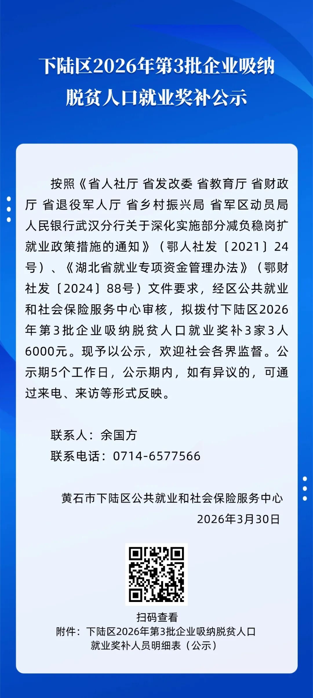 索 引 号: 000014349/2026-18478 发布日期: 2026-03-30 发布机构: 下陆区人社局