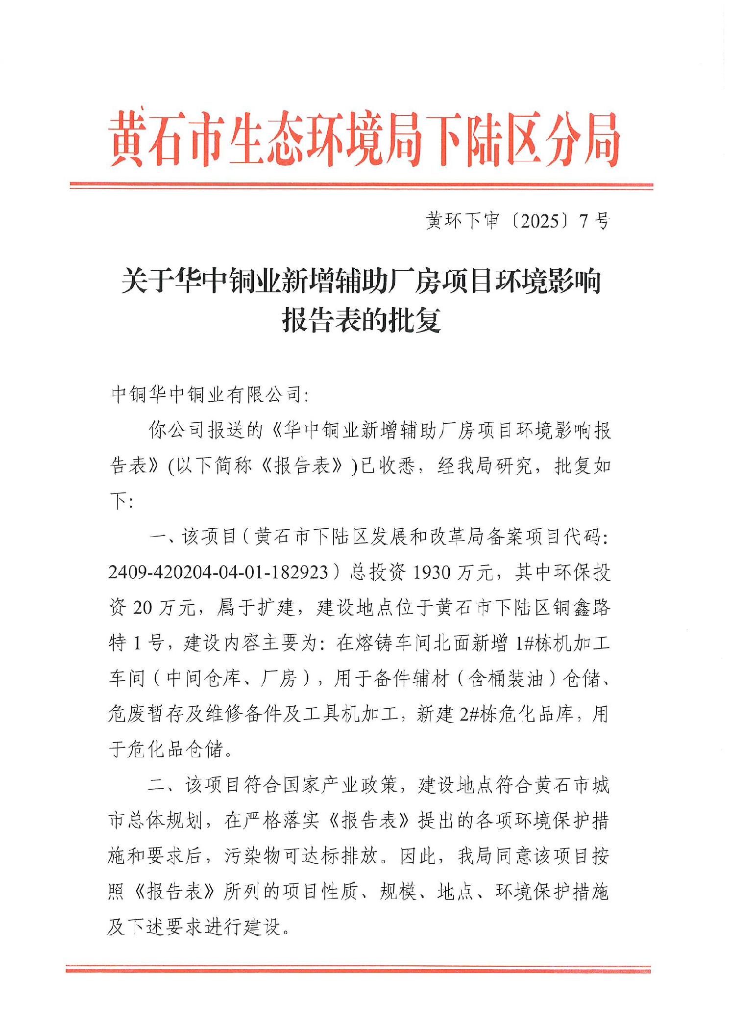 名 称: 关于华中铜业新增辅助厂房项目环境影响报告表的批复
