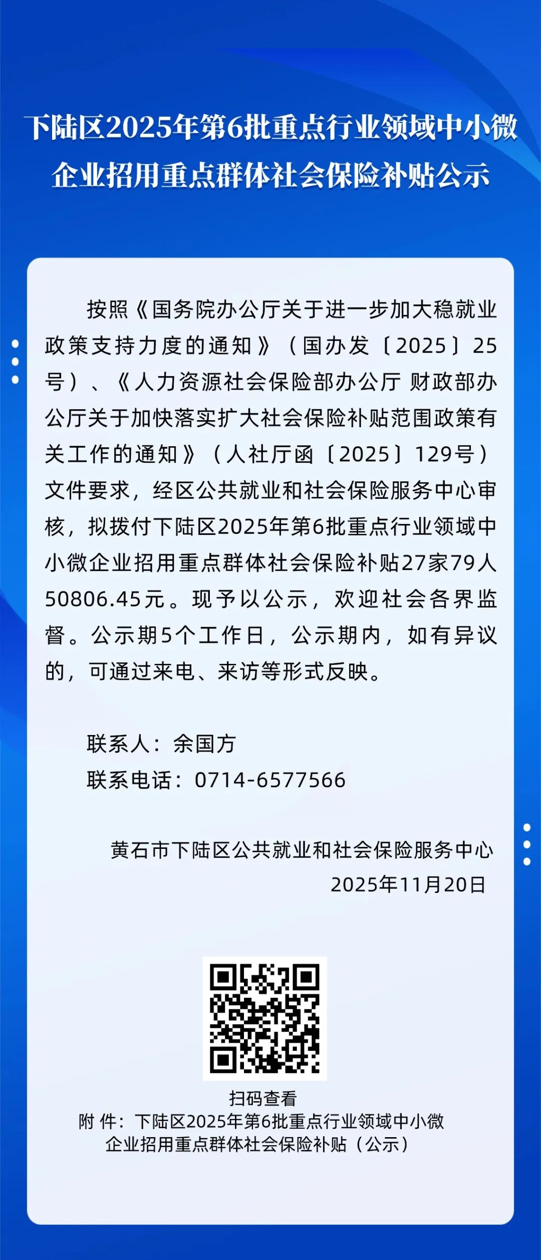 名 称: 下陆区2025年第6批重点行业领域中小微企业招用重点群体社会保险补贴公示