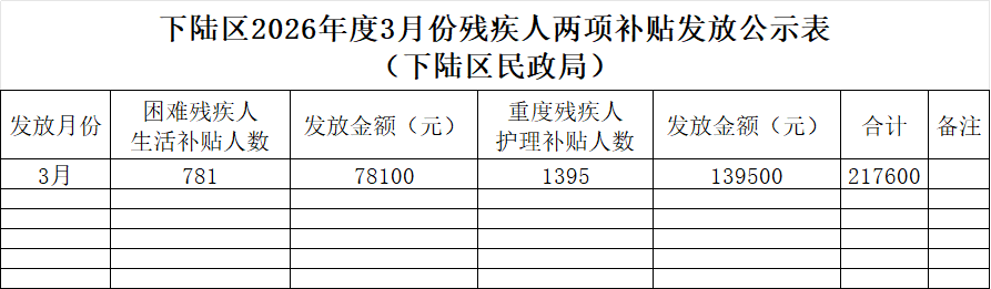 名 称: 下陆区2026年度3月份残疾人两项补贴发放公示表