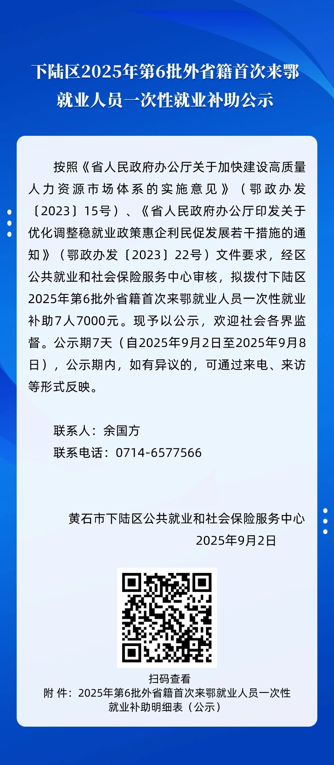 索 引 号: 000014349/2025-70292 发布日期: 2025-09-02 发布机构: 下陆区人社局