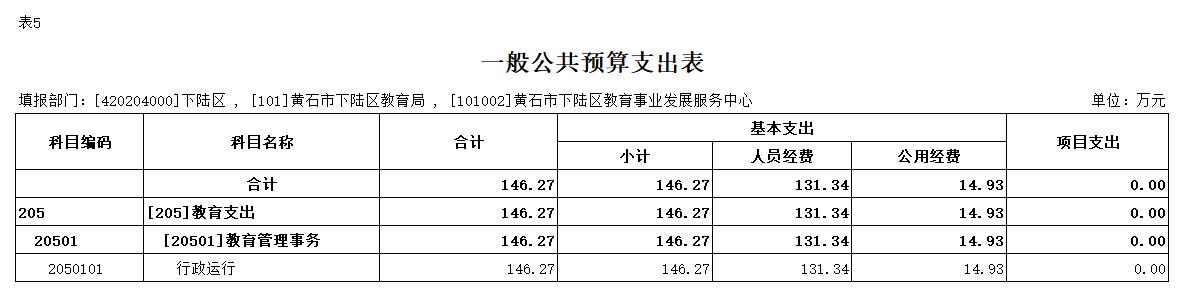 按照综合预算的原则,下陆区教育事业发展服务中心所有收入和支出均纳入部门预算管理。收入包括:一般公共预算拨款收入;支出包括:一般公共教育支出;2024年度收支总预算 146.27万元。