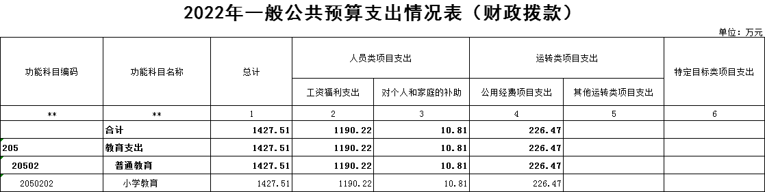 目 录 一、部门主要职责 二、机构设置情况 三、预算收支安排及增减变化情况 四、机关运行经费安排情况说明 五、一般公共预算“三公”经费支出情况说明 六、政府采购安排情况说明 七、国有资产占用情况说明 八、重点项目预算绩效情况说明 九、其他需要说明的情况 十、专业名词解释 十一、2022部门预算表 第一部分 部门主要职责 (一)、执行上级财政政策,严格按照上级财政政策办事。 (二)、承担学校各项收支管理,负责编制年度学校预决算及公开。 (三)、依法制定学校财务制度和管理办法。 (四)、规范财务行为,执行国家会计法律、法规、会计准则和会计制度。 第二部分 机构设置情况 下陆区团城山小学本级为二级预算单位,属事业编制-公益一类。核定编制108人。在职103人,退休30人,遗属1人。学校内设党政办公室、教务处、德育处、总务处(含财务室)4个机构。 第三部分 预算收支安排及增减变化情况 (一)收入支出预算总体情况及增减变化情况说明 按照综合预算的原则,下陆区团城山小学所有收入和支出均纳入部门预算管理。收入包括:一般公共预算拨款收入;支出包括:一般人员类项目支出、运转类项目等支出;2022年度收支总预算 1427.51 万元。 其中:1、收入预算情况 。2022年度收入预算 1427.51 万元,比上年预算增加 156.99 万元,增长 12.36 %。其中,一般公共预算拨款收入 1427.51 万元,占本年收入 100 %,包括经费拨款 1427.51 万元; 收入增加原因:人事调动及在职人员级别滚动等,工资、公积金、保险、学生人数等相应增加。 2、支出预算情况。2022年度支出预算 1427.51 万元, 万元, 比上年预算增加 156.99 万元,增长 12.36 %。按支出功能分类本年支出预算构成为:人员类项目支出 1201.03万元,占本年支出 84.14 %;运转类项目等支出 226.48万元,占本年支出 15.86 %; 按支出结构划分本年支出预算构成为:基本支出 1427.51万元,占总支出的 100 %;项目支出 0 万元,占总支出的 0 %; 支出增加原因:人员正常晋升增资相应的支出增加;相关业务工作资金增加。 (1)2022年基本支出比上年预算增加 156.99 万元,增长 12.36 %,主要是人员正常晋升增资公用经费相应的支出增加; (2)2022年项目支出比上年预算增加 0万元,增长 0 %,。 (二)财政拨款收支预算总体情况说明 2022年度财政拨款收支总预算1427.51万元,收入全部为一般公共预算拨款(无政府性基金预算及国有资本经营预算拨款)。 支出包括:人员类支出 1201.03万元,占 84.14 %;运转类等支出 226.48 万元,占 15.86 %; (三)一般公共预算支出情况说明 1、一般公共预算支出规模变化情况。 2022年度一般公共预算支出 1427.51 万元,与上年预算相比,一般公共预算支出增加156.99万元,增长 12.36 %。主要原因:一是人员正常晋升增资相应的支出增加;二是增加相关业务资金。 2、一般公共预算支出结构情况。 2022年度一般公共预算支出 1427.51 万元,主要用于以下方面:一般人员经费支出1201.03万元,占84.14%;公用经费等支出 226.48万元,占 15.86 %。 3、一般公共预算支出具体使用情况。 (1)一般人员经费2022年预算数为 1201.03万元,比上年预算增加 174.16万元,增长 13.71 %。主要原因是人员正常晋升增资相应的支出增加。 (2)一般公有经费2022年预算数为 226.48 万元,比上年预算减少17.17 万元,下降 1.36%。主要原因是减少公用经费增加。 (四)一般公共预算基本支出情况说明 2022年度一般公共预算基本支出 1427.51万元,其中: 人员经费 1201.03万元,主要包括:基本工资 439.29万元、津贴补贴 78.59 万元、奖金36.61万元、绩效工资222.22万元、机关事业单位基本养老保险缴费124.27万元、职工基本医疗保险缴费104.86万元、住房公积金93.2万元、其他工资福利支出91.18万元、生活补助1.01万元、医疗费补助9.80万元; 公用经费 226.47万元,主要包括:办公费 28.51万元、印刷费4.88万元、咨询费0万元、手续费0万元、水费3.75万元、电费 10.48 万元、邮电费 5.14 万元、物业管理费1.03万元、差旅费 0.099 万元、维修(护)费43.02万元、租赁费1.19万元、培训费0.01 万元、专用材料费2.22万元、劳务费17.06万元、委托业务费9.30万元、工会经费25.84万元、福利费13.87万元、其他商品和服务支出10.83万元、办公设备购置99.57万元。 (五)政府性基金预算支出情况说明 2022年本部门预算中没有使用政府性基金预算拨款安排的支出,故无此项预算,与上年一致。 (六)国有资本经营预算支出情况说明 2022年本部门预算中没有使用国有资本经营预算拨款安排的支出,故无此项预算,与上年一致。 (七)项目支出预算情况说明 2022年度预算中没有安排项目支出,故无此项预算,与上年一致。 第四部分 机关运行经费安排情况说明 2022年度事业单位运行人员经费预算总额为 1201.03万元,比上年增加174.16万元,增长13.71%,增加原因主要是:人员正常晋升增资相应的支出增加。 2022年度公用经费预算包括:办公费 28.51万元、印刷费4.88万元、咨询费0万元、手续费0万元、水费3.75万元、电费 10.48 万元、邮电费 5.14 万元、物业管理费1.03万元、差旅费 0.099万元、维修(护)费43.02万元、租赁费1.19万元、培训费0.01万元、专用材料费2.22万元、劳务费17.06万元、委托业务费9.3万元、工会经费25.84万元、福利费13.87万元、其他商品和服务支出10.83万元、办公设备购置99.57万元。 第五部分 一般公共预算“三公”经费支出情况说明 (一)一般公共预算“三公”经费支
