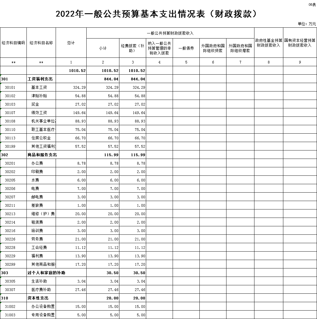 目录一、部门主要职责 二、机构设置 三、预算收支总体情况说明 四、预算收支增减变化情况说明 五、机关运行经费安排情况说明 六、政府采购安排情况 七、“三公”经费增减变化情况说明 八、国有资产占有情况说明 九、重点项目预算绩效情况说明 十、专业名词解释 附件: 1.2022年部门收支总体情况表 2.2022年部门收入预算情况表 3.2022年部门支出预算情况表 4.2022年财政拨款收支预算总表 5.2022年一般公共预算支出情况表 (财政拨款) 6.2022年一般公共预算基本支出表 (财政拨款) 7.2022年部门“三公”经费支出预算表 (财政拨款) 8.2022年政府性基金预算支出情况表 9.项目支出表 一、部门主要职责 1、执行上级财政政策,严格按照上级财政政策办事; 2、承担学校各项收支管理,负责编制年度学校预决算及公开; 3、依法制定学校财务制度和管理办法; 4、规范财务行为,执行国家会计法律、法规、会计准则和会计制度。 二、机构设置 黄石市铜都小学属事业编制-公益一类,内设机构有办公室、财务室、后勤。核定编制88人,在职人数63人,退休2人,遗属3人,2021年秋学生人数1604人。 三、预算收支总体情况说明 2022年部门预算总收入1010.52 万元,其中财政拨款收入1010.52万元,占预算收入 100 %。 2022年部门预算总支出 1010.52 万元,其中基本支出 1010.52万元,占比 100 %;项目支出0 万元,占比 0 %。 四、预算收支增减变化情况说明 1.收入情况:2022年部门预算总收入为1010.52 万元,较上年879.86万元增加130.66万元,增幅14.85%。其中:一般公共预算财政拨款收入1010.52万元,占部门预算总收入的比重为100 %;非税收入拨款0万元,占部门预算总收入的比重为0。 2、支出情况:2022年部门预算总支出为1010.52万元,较上年879.86万元增加130.66万元,增幅14.85%。其中:基本支出1010.52万元,占比100 %;项目支出0万元,占比0%。 3、增减变化原因:1、养老保险和职业年金的单位支出部分增加。2、有2位教师退休,较去年减少2位。 五、机关运行经费安排情况说明 2022年运行经费共计115.99万元,其中包括办公费8.78万元、印刷费2万元、水费6万元、电费7万元、邮电费3万元、差旅费1万元、维护费20万元、租赁费2万元、培训费3万元、劳务费21万元、工会经费、11.12万元、福利费13.9万元、其他商品和服务费17.2万元。 六、政府采购安排情况 2022我单位政府预算采购计划金额为 0 万元,计划用于购买货物 0 万元,工程0 万元,服务 0 万元。 七、“三公”经费增减变化情况说明 2022年财政拨款安排“三公”经费预算0万元,较上年预算0万元,同比无变化。其中: 1、因公出国(境)费用预算为0万元,共计0组,0人次,较上年预算0万元,同比无变化。 2、公务用车购置及运行维护费预算为0 万元。 (1)公务用车购置费预算为0万元,较上年预算0万元,同比无变化 ; (2)公务用车运行费预算支出为 0万元,较上年预算0万元,同比无变化。 3、公务接待费预算为0万元,较上年预算0万元,同比无变化 。 八、国有资产占有情况说明 2022年度我单位共占有车辆数0台,其中:一般公务用车0 台,单价50万元以上通用设备0 台;单价100万元以上专用设备0 台。 九、重点预算项目绩效情况说明 1.预算绩效管理工作开展情况 2022年,我学校进一步加强财政资金监管,稳步推进预算管理绩效评价工作,促进财政资金使用效益不断提升,财政资金使用更加安全、高效,逐步实现财政科学化、精细化管理目标。 2.部门预算重点项目绩效情况 2022年,我单位无项目支出,全年预算均为基本支出,未设置预算绩效目标。 十、专业名词解释 1、财政拨款收入:指财政部门当年拨付的资金。 2、事业收入:指事业单位开展专业业务活动及辅助活动所取得的收入。 3、经营收入:指事业单位在专业业务活动及其辅助活动之外开展非独立核算经营活动取得的收入。 4、其他收入:指除上述“财政拨款收入”、“事业收入”、“经营收入”等以外的收入。 5、用事业基金弥补收支差额指事业单位在当年的“财政拨款收入”、“事业收入”、“经营收入”、“其他收入”不足以安排当年支出的情况下,使用以前年度积累的事业基金(事业单位当年收支相抵后按国家规定提取、用于弥补以后年度收支差额的基金)弥补本年度收支缺口的资金。 6、年初结转和结余:指以前年度尚未完成、结转到本年 按有关规定继续使用的资金。 7、结余分配:指事业单位按规定提取的职工福利基金、事业基金和缴纳的所得税,以及建设单位按规定应交回的基本建设竣工项目结余资金。 8、年末结转和结余:指本年度或以前年度预算安排、因客观条件发生变化无法按原计划实施,需要延迟到以后年度按有关规定继续使用的资金。 9、基本支出:指为保障机构正常运转、完成日常工作任务而发生的人员支出和公用支出。 10、项目支出:指在基本支出之外为完成特定行政任务和事业发展目标所发生的支出。 11、经营支出:指事业单位在专业业务活动及其辅助活动之外开展非独立核算经营活动发生的支出。 12、“三公”经费:纳入财政预决算管理的“三公”经费,是指各部门用财政拨款安排的因公出国(境)费、公务用车购置及运行费和公务接待费。其中,因公出国(境)费反映单位公务出国(境)的国际旅费、国外城市间交通费、住宿费、伙食费、培训费、公杂费等支出;公务用车购置及运行费反映单位公务用车车辆购置支出(含车