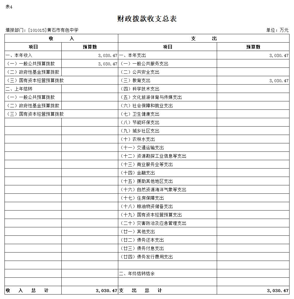 按照综合预算的原则,黄石市实验中学所有收入和支出均纳入部门预算管理。收入包括:一般公共预算拨款收入;支出包括:教育支出。2024年度收支总预算3030.47万元。
