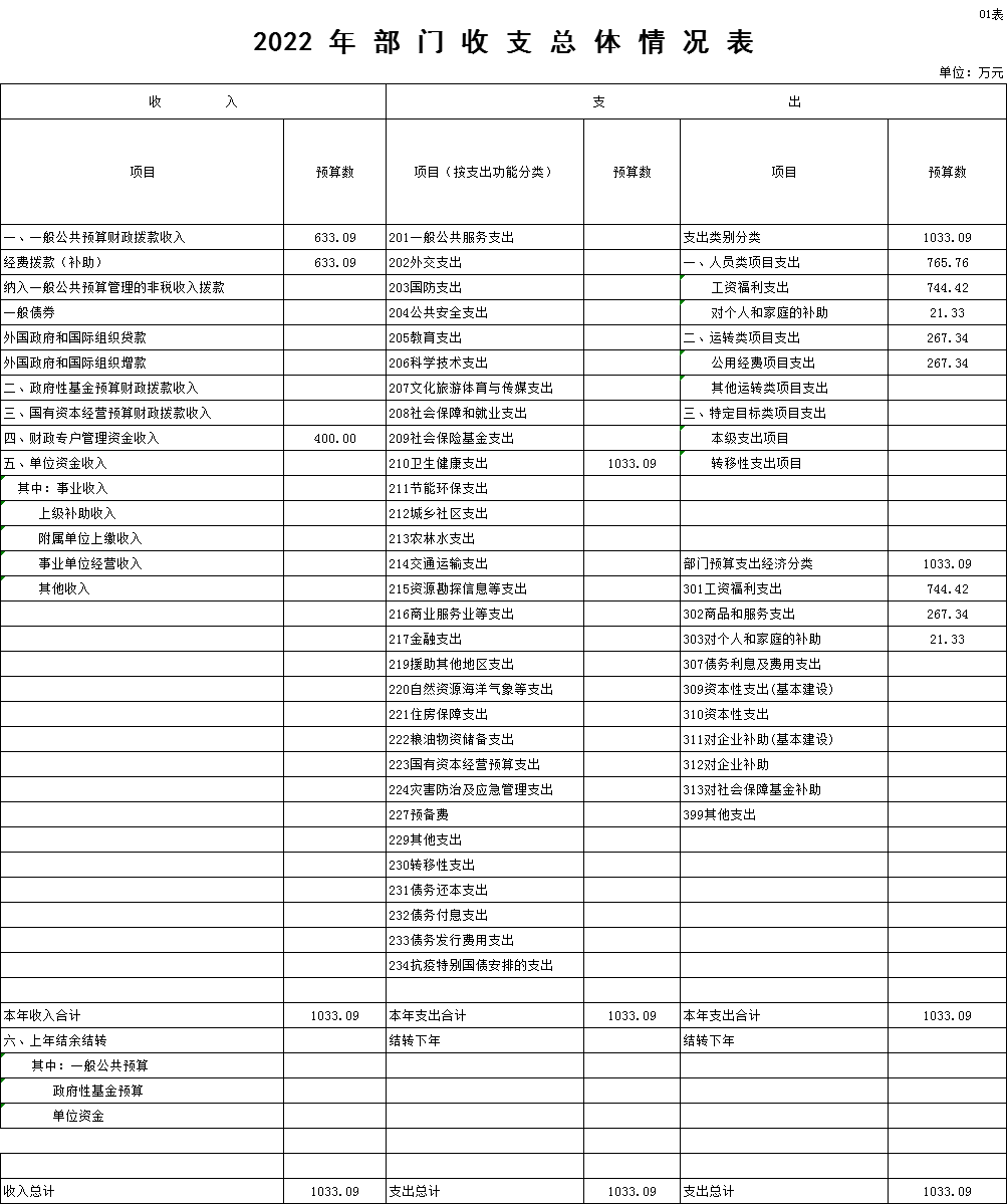 目录 一、部门主要职责 二、机构设置 三、预算收支总体情况说明 四、预算收支增减变化情况说明 五、机关运行经费安排情况说明 六、政府采购安排情况 七、“三公”经费增减变化情况说明 八、国有资产占有情况说明 九、重点项目预算绩效情况说明 十、专业名词解释 附件: 1.2022年部门收支总体情况表 2.2022年部门收入预算情况表 3.2022年部门支出预算情况表 4.2022年财政拨款收支预算总表 5.2022年一般公共预算支出情况表 (财政拨款) 6.2022年一般公共预算基本支出表 (财政拨款) 7.2022年部门“三公”经费支出预算表 (财政拨款) 8.政府性基金预算支出情况表 9.项目支出表 一、部门主要职责 黄石市下陆区东方社区卫生服务中心是一所集医疗、预防、保健、康复为一体的综合卫生服务机构,担负着辖区社区的医疗和公共卫生服务。 二、机构设置 下陆区东方社区卫生服务中心核定编制数为78人,其中事业编制78人。2021年年末在职在编人员50人,三支一扶人员1人,退休人员62人(已全部转入机关事业单位养老保险发放养老金)。 三、预算收支总体情况说明 2022年部门预算总收入1033.09万元,其中财政拨款收入633.09万元,占预算收入61.28 %。 2022年部门预算总支出1033.09万元,其中基本支出1033.09万元,占比100%;项目支出0万元,占比0%。 四、预算收支增减变化情况说明 2022年部门预算总收入1033.09万元,其中财政拨款收入633.09万元。较2021年预算总收入622.33万元增加410.76万元,增加的主要原因是2021年事业收入未纳入财政预算收入。 2022年部门预算总支出1033.09万元,较2021年预算总支出622.33万元增加410.76万元,增加的主要原因是2021年事业支出未纳入财政预算支出。 五、机关运行经费安排情况说明 我单位2022年运行经费预算总额为67.34万元,用于办公费、水电费、邮电费、差旅费、维修(护)费、培训费、公务接待费、劳务费、专用材料费、委托业务费、公务用车运行维护费等。 六、政府采购安排情况 2022我单位政府预算采购计划金额为0万元,计划用于购买货物0万元,工程0万元,服务0万元。 七、“三公”经费增减变化情况说明 2022年度“三公”经费支出预算数为0万元,同比减少了3.50万元,减幅100 % 。 1、因公出国(境)费用支出预算为0万元,共计0组,0人次。 2、公务用车购置及运行维护费支出预算为0万元。 (1)公务用车购置费预算支出为0万元,较2021年预算0万元增加/减少0万元,增加/减少的原因是2022年无公务用车购置计划。 (2)公务用车运行费预算支出为0万元,较2021年预算3.50万元减少3.50万元,减少的原因是2022年公务用车运行费未纳入预算支出。 3、公务接待费预算数为0万元,较2021年预算0万元增加/减少0万元,与上年持平。 八、国有资产占有情况说明 2022年度我单位共占有车辆数2台,其中:一般公务用车 2台,单价50万元以上通用设备0台;单价100万元以上专用设备 1台。 九、重点预算项目绩效情况说明 1.预算绩效管理工作开展情况 因我单位在 2022年预算中无重点项目专项资金财政拨款,故无此项说明。 2.部门预算重点项目绩效情况 因我单位在 2022年预算中无重点项目专项资金财政拨款,故无此项说明。 十、专业名词解释 1、财政拨款收入:指财政部门当年拨付的资金。 2、事业收入:指事业单位开展专业业务活动及辅助活动所取得的收入。 3、经营收入:指事业单位在专业业务活动及其辅助活动之外开展非独立核算经营活动取得的收入。 4、其他收入:指除上述“财政拨款收入”、“事业收入”、“经营收入”等以外的收入。 5、用事业基金弥补收支差额指事业单位在当年的“财政拨款收入”、“事业收入”、“经营收入”、“其他收入”不足以安排当年支出的情况下,使用以前年度积累的事业基金(事业单位当年收支相抵后按国家规定提取、用于弥补以后年度收支差额的基金)弥补本年度收支缺口的资金。 6、年初结转和结余:指以前年度尚未完成、结转到本年 按有关规定继续使用的资金。 7、结余分配:指事业单位按规定提取的职工福利基金、事业基金和缴纳的所得税,以及建设单位按规定应交回的基本建设竣工项目结余资金。 8、年末结转和结余:指本年度或以前年度预算安排、因客观条件发生变化无法按原计划实施,需要延迟到以后年度按有关规定继续使用的资金。 9、基本支出:指为保障机构正常运转、完成日常工作任务而发生的人员支出和公用支出。 10、项目支出:指在基本支出之外为完成特定行政任务和事业发展目标所发生的支出。 11、经营支出:指事业单位在专业业务活动及其辅助活动之外开展非独立核算经营活动发生的支出。 12、“三公”经费:纳入财政预决算管理的“三公”经费,是指各部门用财政拨款安排的因公出国(境)费、公务用车购置及运行费和公务接待费。其中,因公出国(境)费反映单位公务出国(境)的国际旅费、国外城市间交通费、住宿费、伙食费、培训费、公杂费等支出;公务用车购置及运行费反映单位公务用车车辆购置支出(含车辆购置税)及租用费、燃料费、维修费、过路过桥费、保险费、安全奖励费用等支出;公务接待费反映单位按规定开支的各类公务接待(含外宾接待)支出。 13、机关运行经费:为保障行政单位(含参照公务员法管理的事业单位)运行用于购买货物和服务的各项资金,包括办公及印刷费、邮电费、差旅费、会议费、福利