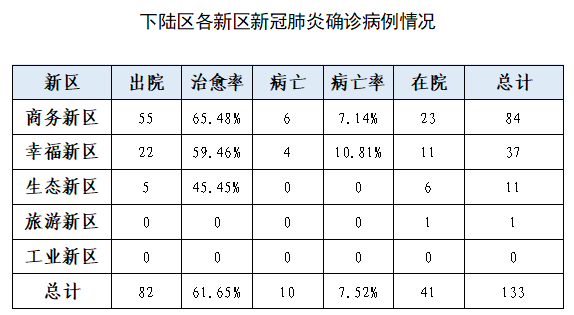从区防控指挥部获悉,2月28日0-24时,下陆区无新增新冠肺炎确诊病例。截至2月28日24时,下陆区累计报告新冠肺炎确诊病例133例,其中,生态新区11例,商务新区84例,幸福新区37例、旅游新区1例。新增出院5例,全区累计出院82例。目前仍在院治疗41例,均在定点医院接受隔离治疗。累计追踪密接者615人,尚在接受医学观察143人。新增病亡1例,累计病亡10例。