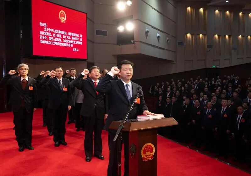 大会随后进行宪法宣誓仪式。张坚领誓,其他宣誓人员跟诵誓词。