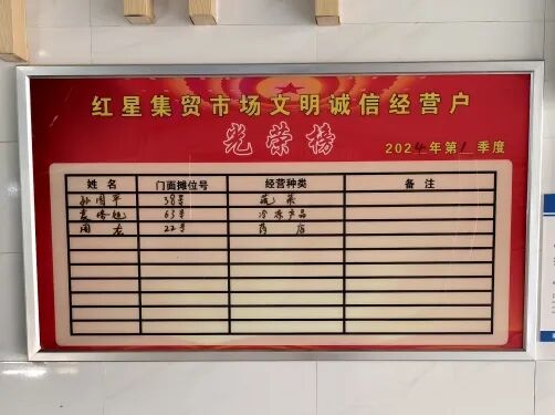 红星集贸市场以全市“最美个体工商户”甘石生为示范,设立文明诚信经营户光荣榜,形成了文明礼貌、诚信经营的良好氛围。“我们的经营离不开市场的好规矩,大家齐心协力维护市场环境。”今年一季度被评为文明诚信经营户的孙国平笑道。