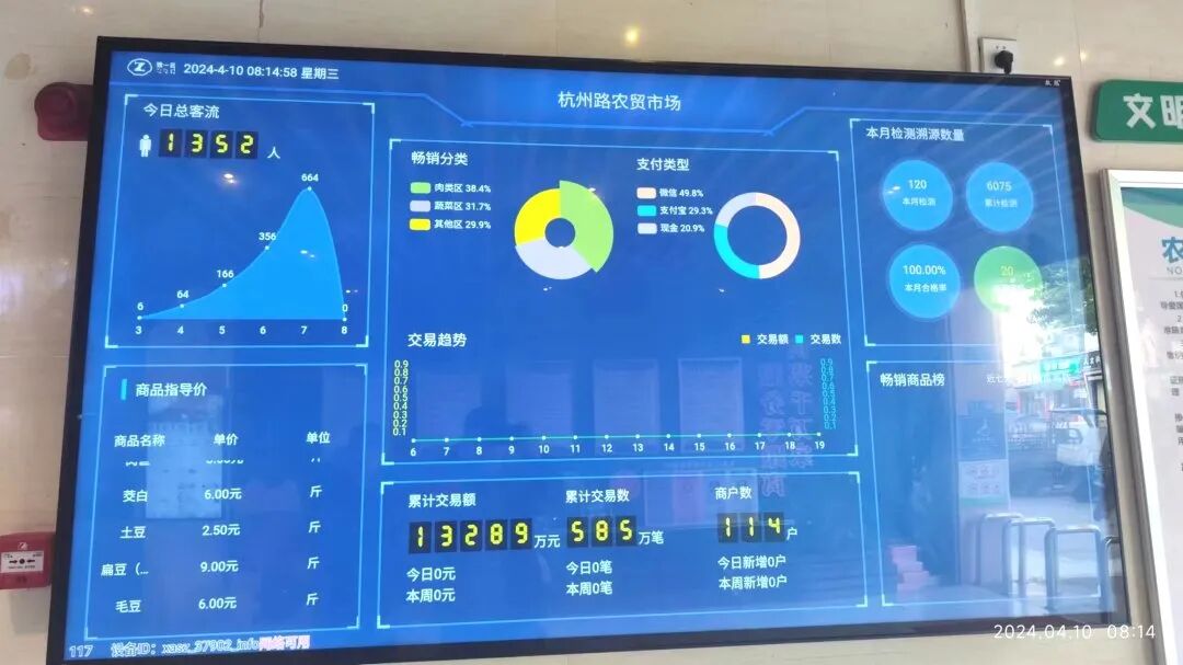 在杭州路集贸市场,智慧监控技术的应用让市场运营效率和服务质量得到了显著提升。实时更新的3块电子屏上,展示着丰富的菜品信息和价格;智能分析系统实时监控市场的客流量和人流密度,有效避免拥挤;菜品溯源系统增强食品安全的保障,让市民购物更有放心。