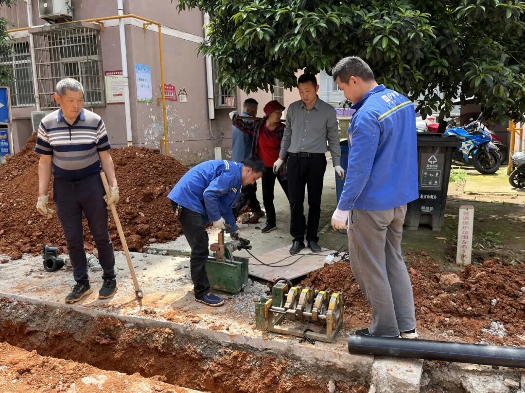5月27日,詹爱宇社区新兴花苑小区居民胡阿姨看着小区内,前期挖开的路面已经做好平整,工人正在为楼栋预留分表管道,她期待水改项目能够尽快完工通水。詹爱宇社区新兴花苑小区、万家垴小区以及106国道黄浔加油站旁部分民房以前用的是大冶有色的供水,“三供一业”移交后,虽然这些小区供水同属于大冶有色,却不属于“三供一业”项目实施范围,如何解决这部分住户的用水问题,成了摆在大家眼前的难题。从去年开始,东方山街道、大冶有色、詹爱宇社区、小区物业积极与市水务集团沟通协调,经过现场勘查、多方查阅图纸,各部门多次协商,最终决定对辖区片区居民进行供水管网改造,将居民用水管道接入市水务集团下陆段主供水管,解决居民用水难题。经过前期摸排统计,水改项目涉及万家垴小区、新兴花苑小区及106国道黄浔加油站旁部分民房。因整个项目范围广又零散,分为三期进行。据了解,水改将面临解决居民临时性用水、重新敷设新供水管、改造分支供水管、居民楼水管水表改造等一系列难度颇大的施工量,但却是让居民从此和城区绝大多数家庭一样用水的最好途径。“一期万家垴小区700余户已经于2023年12月完工,去年底就已通水。”詹爱宇社区副书记占明曦介绍,二期新兴花苑小区及三期106国道黄浔加油站旁部分民房都在同步加班加点赶进度。目前,新兴花苑小区地下管道已铺设完毕,正在着手准备到户水表安装工作,预计6月底便可完工。