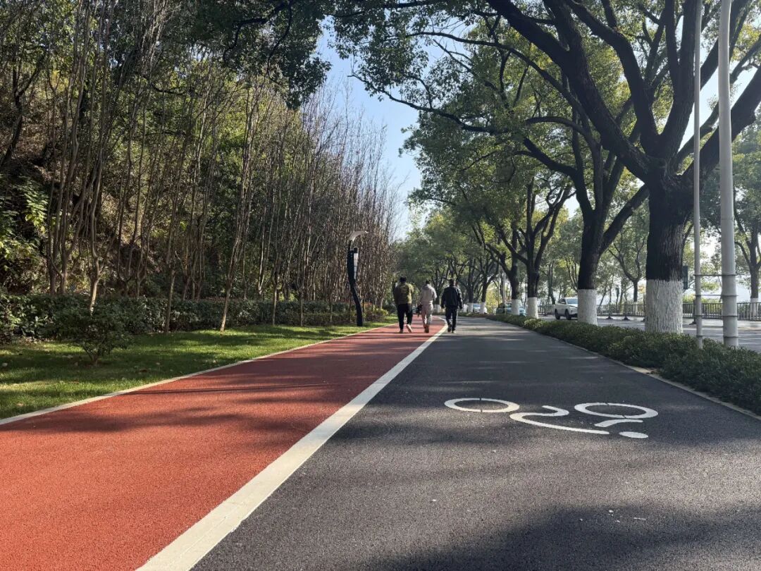在杭州东路崭新的彩色步道上