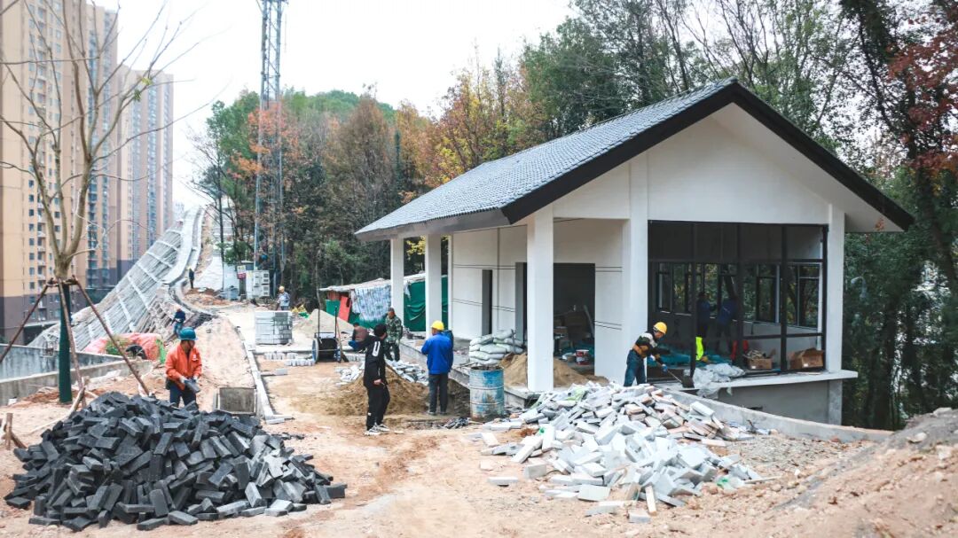公园东入口的广场旁,一座2层的游客驿站拔地而起,8名工人正在进行室内装修。沿着桂林北路公园东入口的步道前行,在大屋湾附近转公园车行道,来到扬子馥园小区附近再转步道,直至步行到百事威小区二期附近的西入口,这一路上的步道表面都铺上了石板。