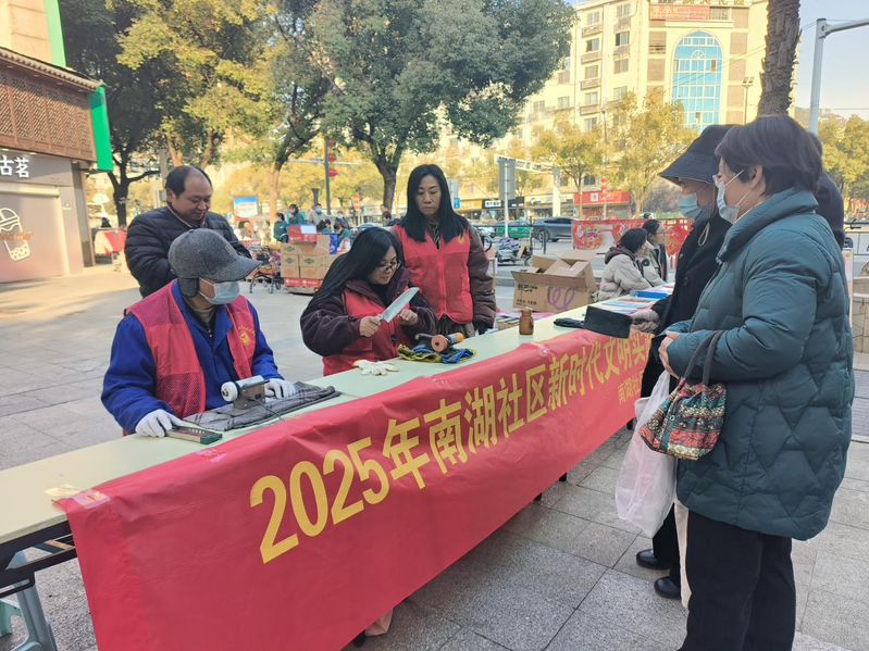 除了年货集市以外,现场还安排了免费磨刀、义诊、金融风险、“扫黄打非”、消防知识讲解等摊位,居民们纷纷带来了家里的剪刀和菜刀,一边饶有兴致地观看师傅磨刀过程,一边拉拉家常讨论筹备年货的心得。沈阿姨拿着磨好的刀高兴地说:“马上要过年啦,做年夜饭需要趁手的厨具,社区想得真贴心。”