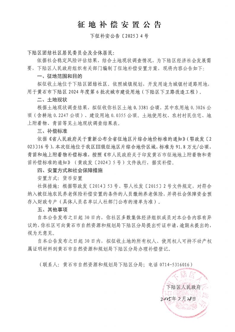 名 称: 征地补偿安置公告(下征补安公告【2025】4号)