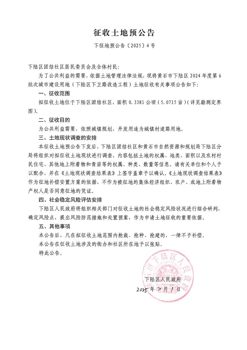 名 称: 征收土地预公告(下征地预公告【2025】4号)