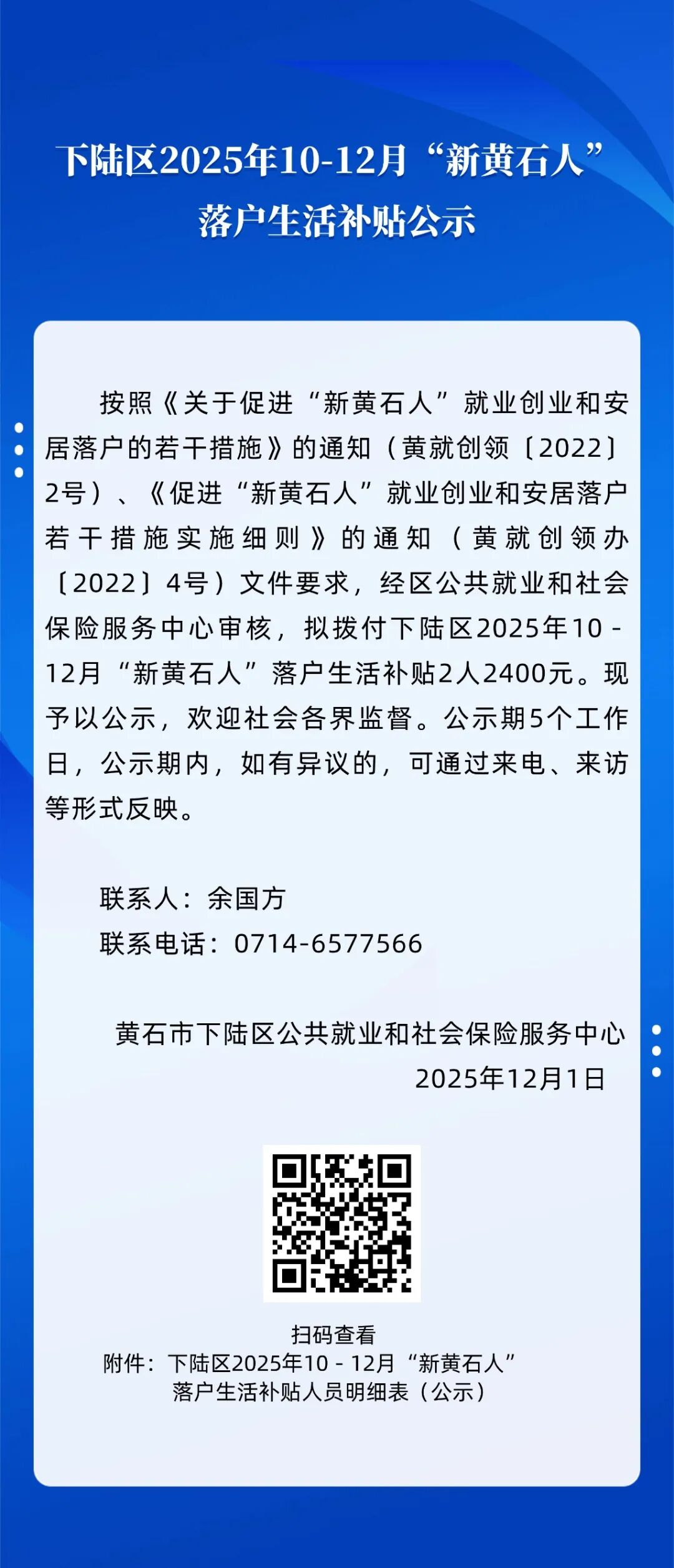 名 称: 下陆区2025年10-12月“新黄石人”落户生活补贴公示