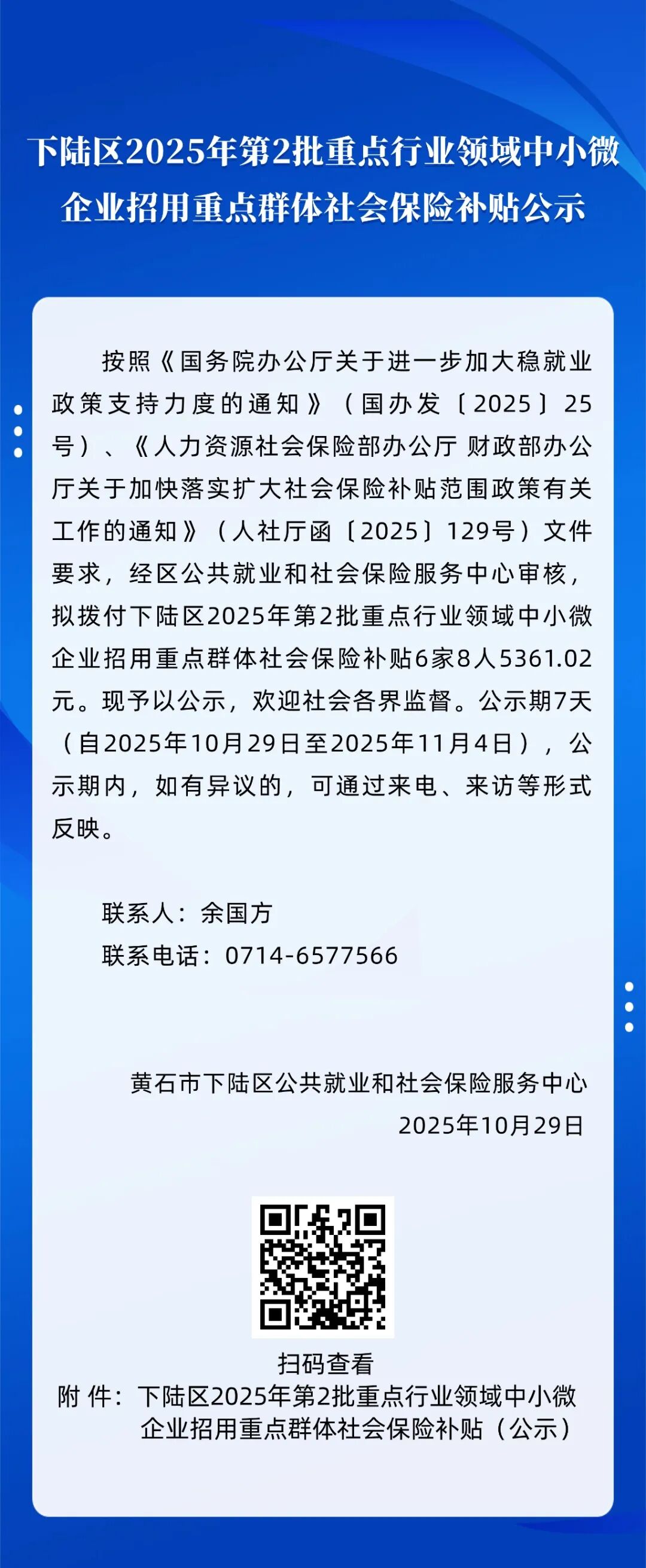 名 称: 下陆区2025年第2批重点行业领域中小微企业招用重点群体社会保险补贴公示