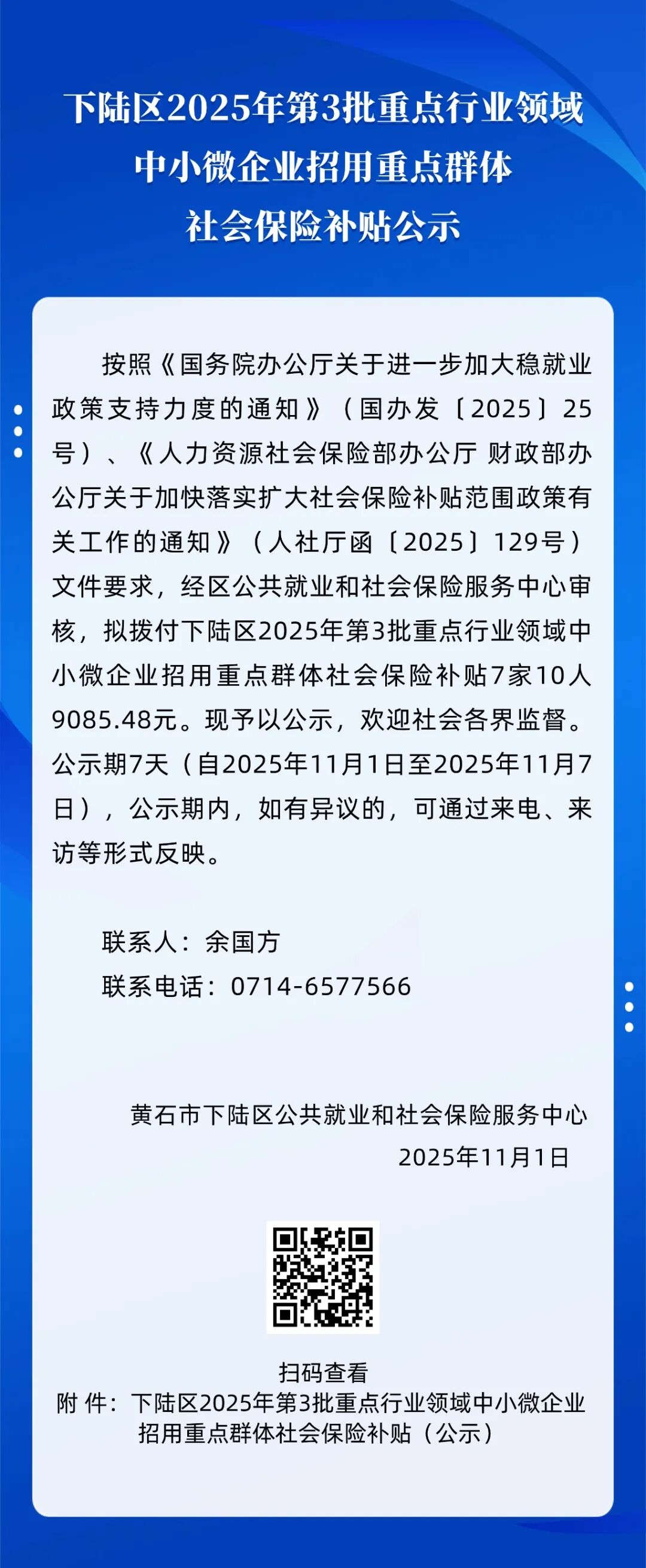名 称: 下陆区2025年第3批重点行业领域中小微企业招用重点群体社会保险补贴公示