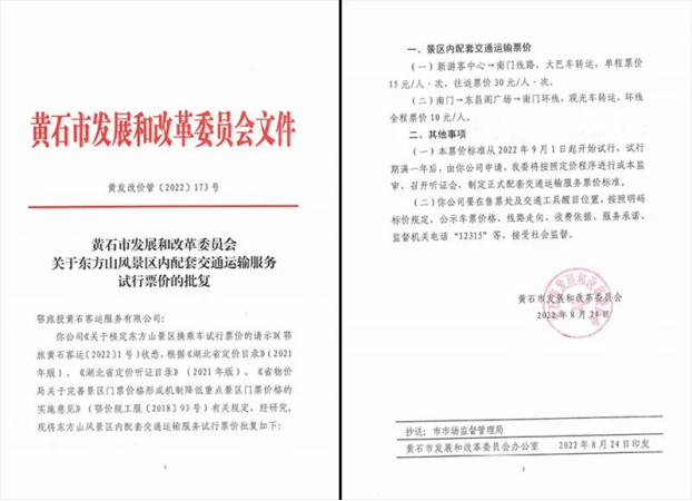 根据黄石市发展和改革委员会相关规定,自2022年12月29日开始,东方山风景区将对景区两条线路交通运输票价进行调价,具体如下: