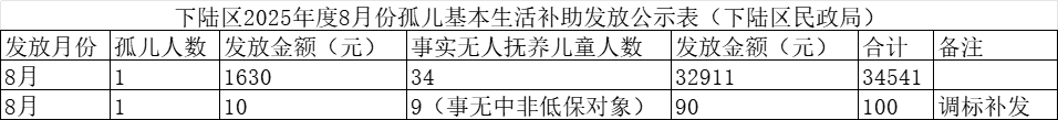 名 称: 下陆区2025年度8月份孤儿基本生活补助发放公示表