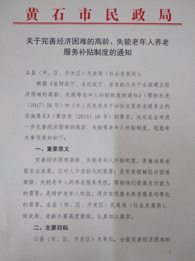 名 称: 关于完善经济困难的高龄、失能老人养老服务补贴制度的通知
