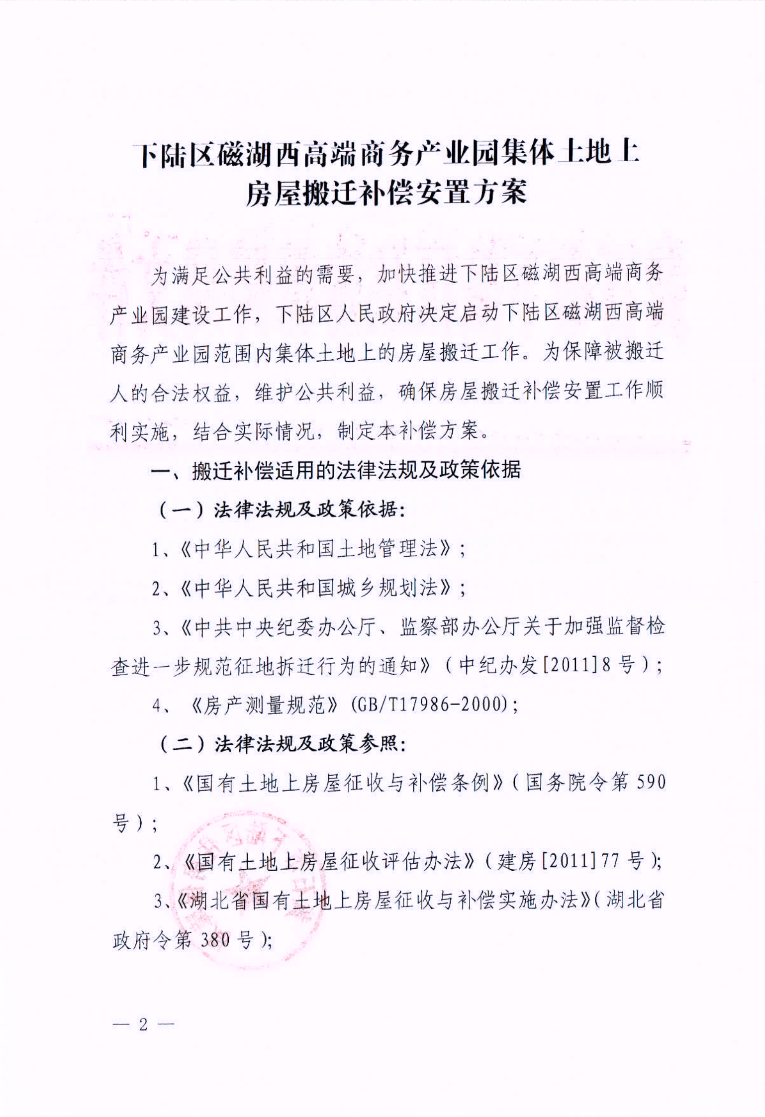 名 称: 下陆区磁湖西高端商务产业园房屋搬迁补偿安置方案