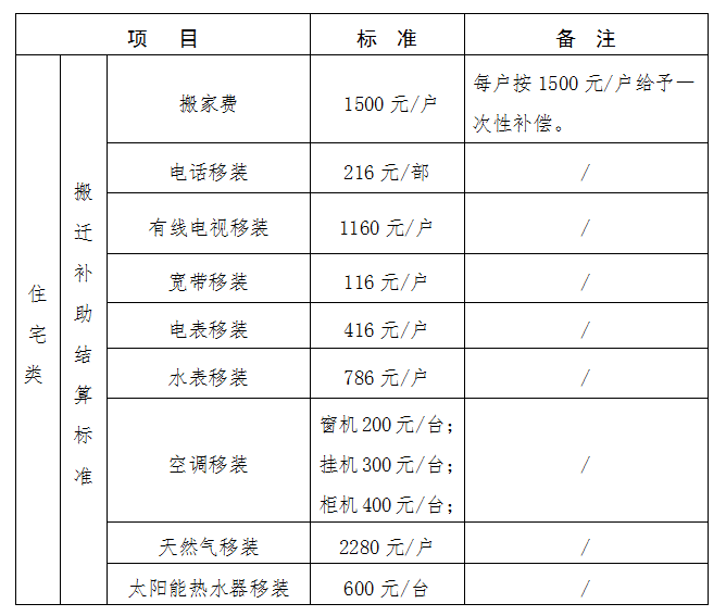 4、搬迁补助费、家用设施设备拆除迁移费的标准如下: