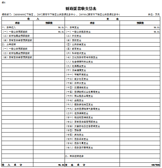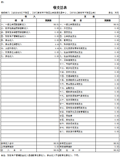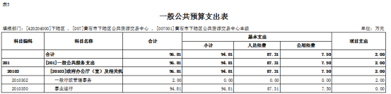 按照综合预算的原则,下陆区公共资源交易中心所有收入和支出均纳入部门预算管理。收入包括:一般公共预算拨款收入;支出包括:一般公共服务支出;2026年度收支总预算96.81万元。